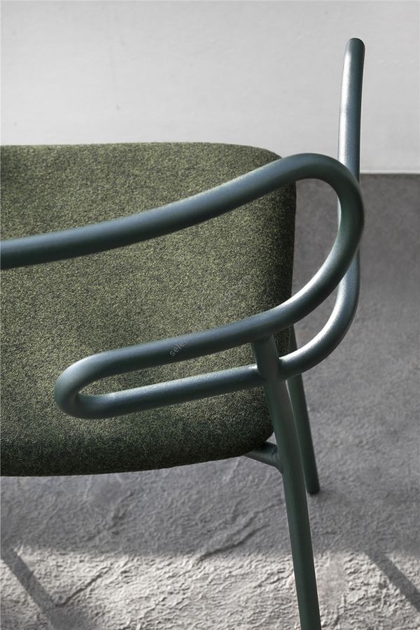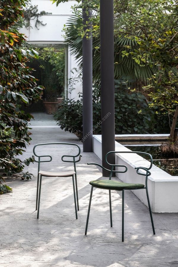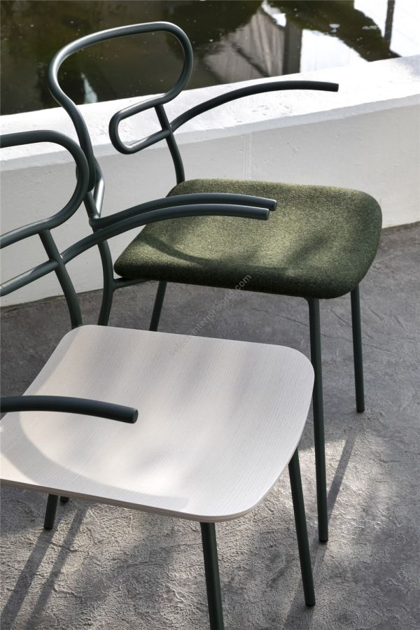 The Genoa seating collection, designed by the young Cesare Ehr, is expanding with the stool and chair with armrests versions, also in the outdoor variant. The characterizing element is the 'one line' backrest, obtained from the curvature of a single metal tube which - with its virtually infinite sinuous line, extended into this new version in the armrests - fits discreetly into any space, connoting it with lightness. At the Salone del Mobile 2019 the outdoor version of the seats is presented - with a body in integral polyurethane painted in the mass and in the mold - also available with a backrest woven with colored rope, which enhances, in addition to aesthetics, the level of comfort. The powder-coated metal tubular structure is available in a wide range of colors; the slightly curved seat - for the indoor versions - is in ash wood (natural or painted), or padded with different fabrics, leather or eco-leather.