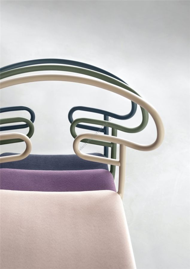 The Genoa seating collection, designed by the young Cesare Ehr, is expanding with the stool and chair with armrests versions, also in the outdoor variant. The characterizing element is the 'one line' backrest, obtained from the curvature of a single metal tube which - with its virtually infinite sinuous line, extended into this new version in the armrests - fits discreetly into any space, connoting it with lightness. At the Salone del Mobile 2019 the outdoor version of the seats is presented - with a body in integral polyurethane painted in the mass and in the mold - also available with a backrest woven with colored rope, which enhances, in addition to aesthetics, the level of comfort. The powder-coated metal tubular structure is available in a wide range of colors; the slightly curved seat - for the indoor versions - is in ash wood (natural or painted), or padded with different fabrics, leather or eco-leather.