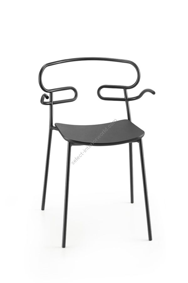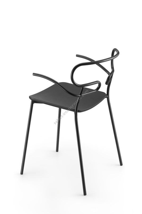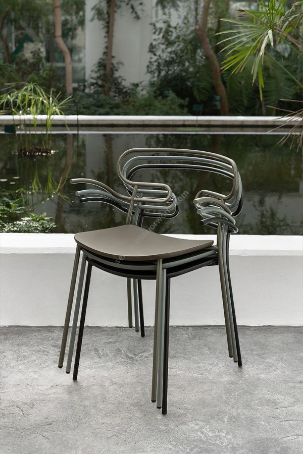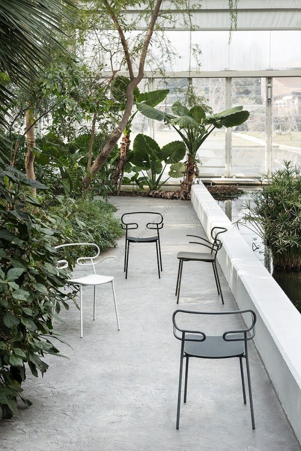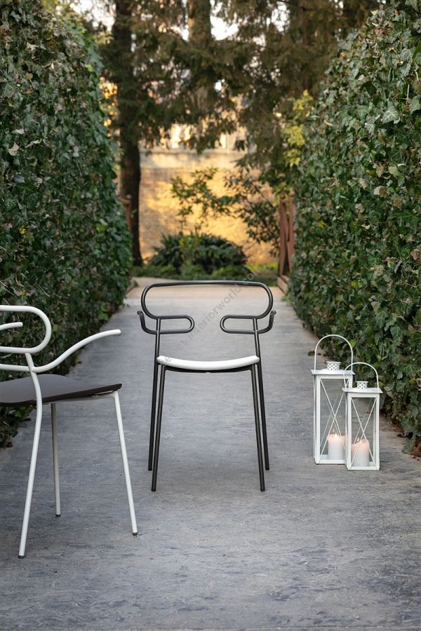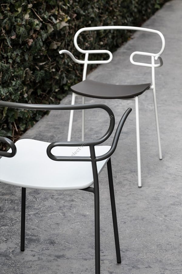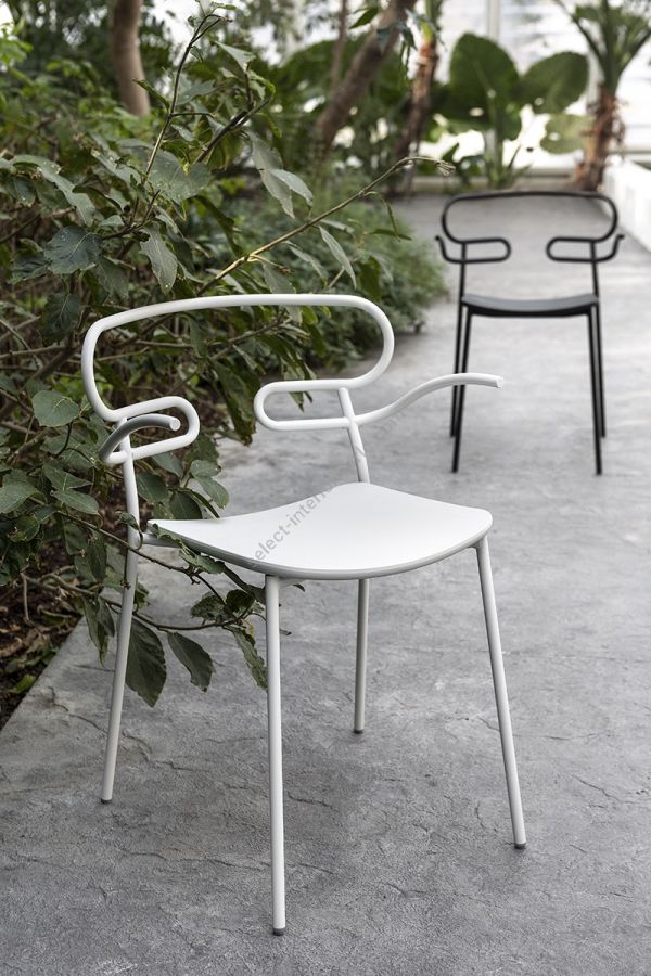 The Genoa chair collection, by talented young designer Cesare Ehr, featuring a stool and a chair with armrests, is also available in an outdoor version. The distinguishing element is the ‘one-line’ backrest, obtained by curving a single metal tube which - with its virtually endless wavy line, also extended to the armrests in this new version - is an elegant addition to every space, bringing a sense of lightness.The outdoor version of the chair will be presented at Salone del Mobile 2019. With integral body in polyurethane, mass painted in the mould, it is also available with a woven backrest in coloured rope to enhance both its look and the level of comfort provided.The frame in powder-coated tubular metal comes in a wide variety of colours; the slightly curved seat - for the indoor versions - is in ash wood (left au naturel or painted) or upholstered with various fabrics, leather or eco-leather.
