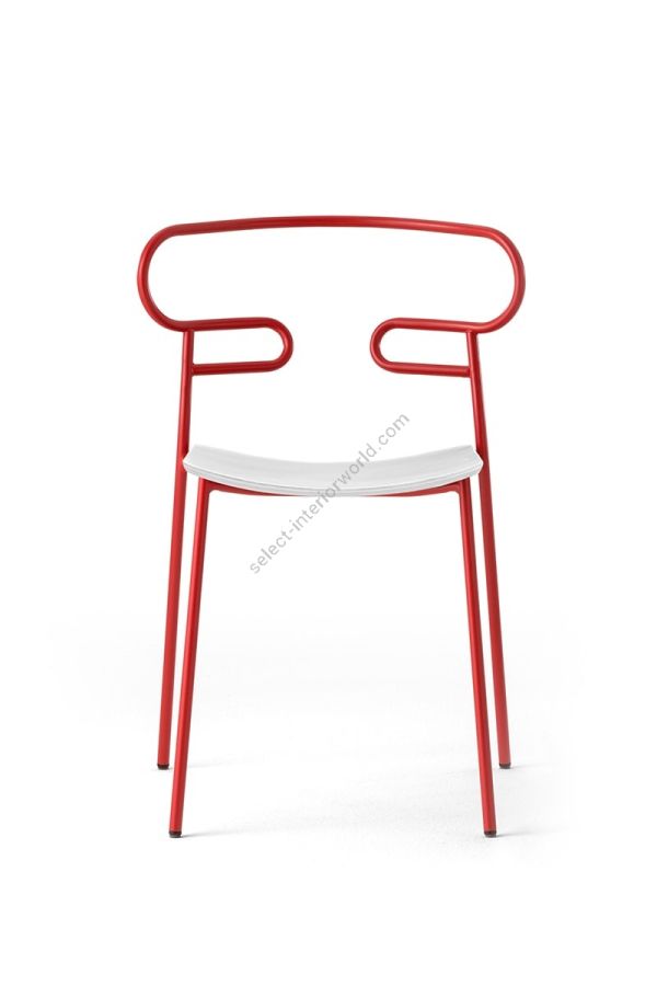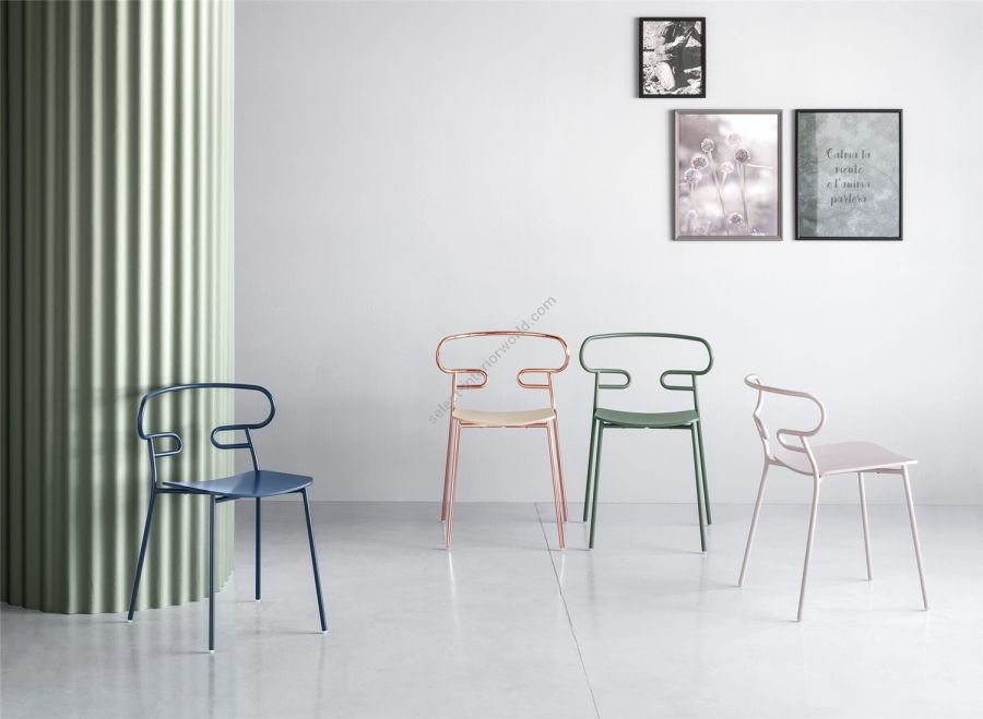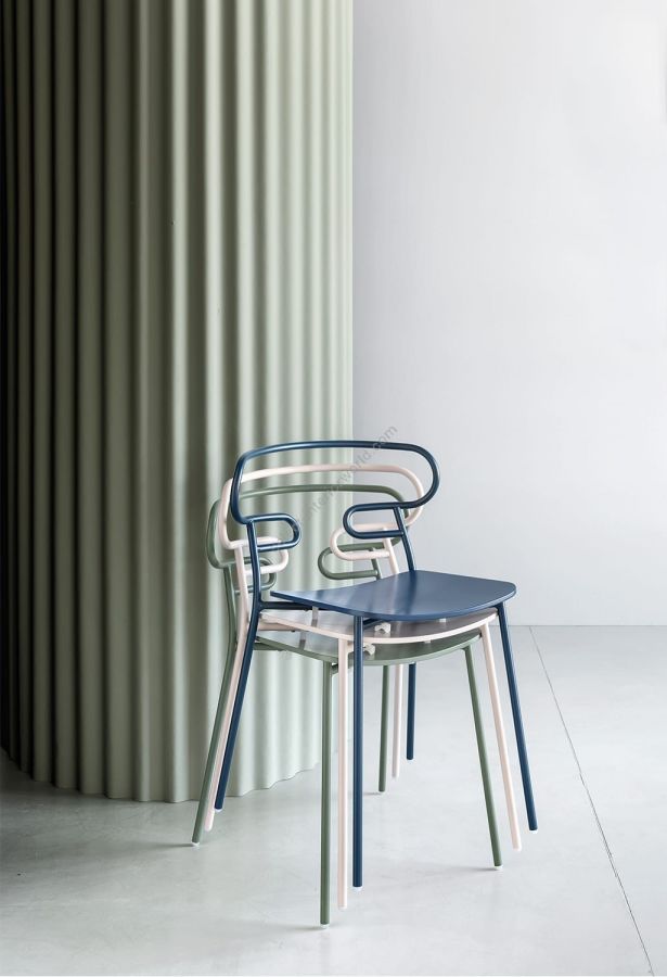 The Genoa seating collection, designed by the young Cesare Ehr, is expanding with the stool and chair with armrests versions, also in the outdoor variant. The characterizing element is the 'one line' backrest, obtained from the curvature of a single metal tube which - with its virtually infinite sinuous line, extended into this new version in the armrests - fits discreetly into any space, connoting it with lightness. At the Salone del Mobile 2019 the outdoor version of the seats is presented - with a body in integral polyurethane painted in the mass and in the mold - also available with a backrest woven with colored rope, which enhances, in addition to aesthetics, the level of comfort. The powder-coated metal tubular structure is available in a wide range of colors; the slightly curved seat - for the indoor versions - is in ash wood (natural or painted), or padded with different fabrics, leather or eco-leather.