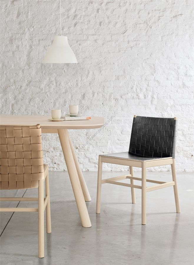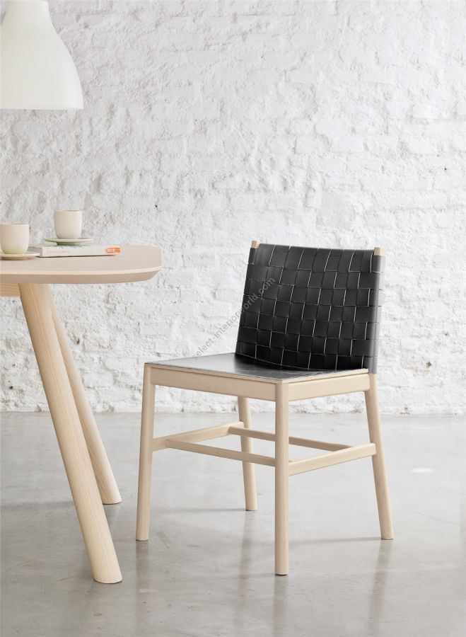 | Description: | Beech with woven leather backrest and wooden seat with applied leather. |