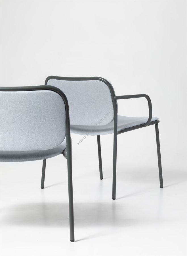 The textures and variety of colour in the fabrics, the quality and tactile experience of leather, and the elegance and softness of velvet combine with metal frames in different tones to give shape and style to a complete collection: a chair with and without armrests, a lounge chair with and without armrests and a stool in two heights. With customisable upholstery options for seats and backrests, Metis Pad brings coordination to different interior spaces, while ensuring every room has its own personality and textures.