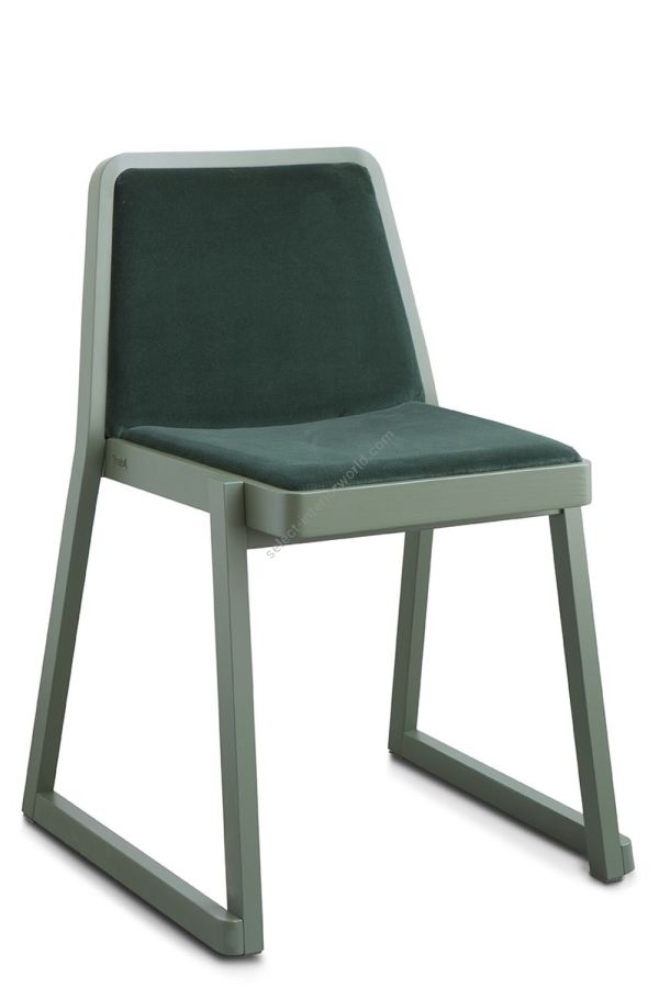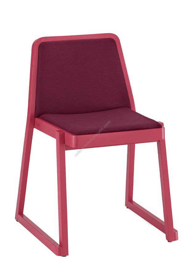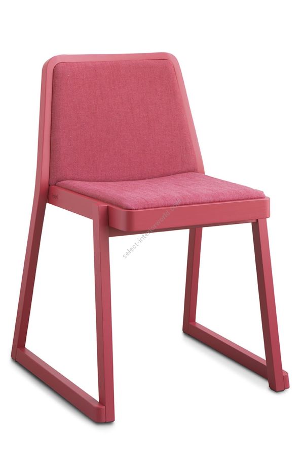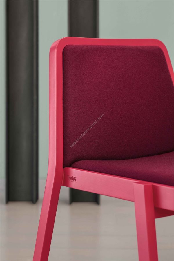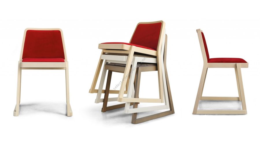 Roxanne is a chair encompassing all the requirements of an iconic object: a strong personality, simplicity of design, and flawless functionality and image. The perfectly calibrated seat and backrest provide excellent comfort. Roxanne is a stackable chair, and therefore lends itself for use in public areas, such as conference halls and meeting rooms. It comes with a beech frame and slanting geometrical lines to ensure maximum stability and ergonomics.The frame, seat and backrest are in beech, either bleached, natural or lacquered in a very wide range of shades. The seat and backrest are padded and upholstered in fabric, velvet, leather, faux leather, or flame retardant Trevira textiles.