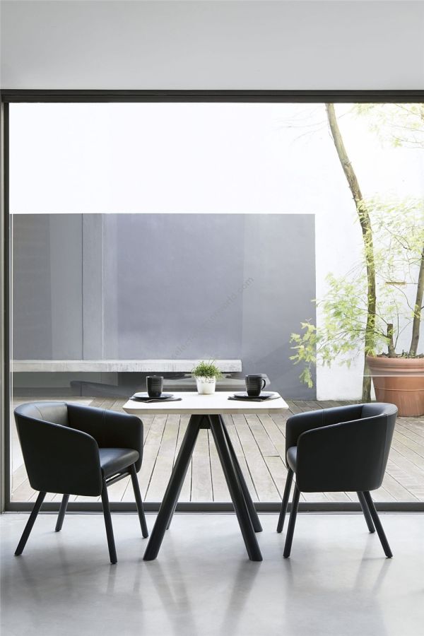 Two new solutions for the AKY table collection, which is enhanced by a tête à tête variant: you can choose between a square or round top, for intimate breakfasts in public environments or to personalise small living spaces. AKY is supported by legs with central meeting point available in wood, combining solid and fluid shapes, or metal, to provide the table with both ascending tension and lightness.