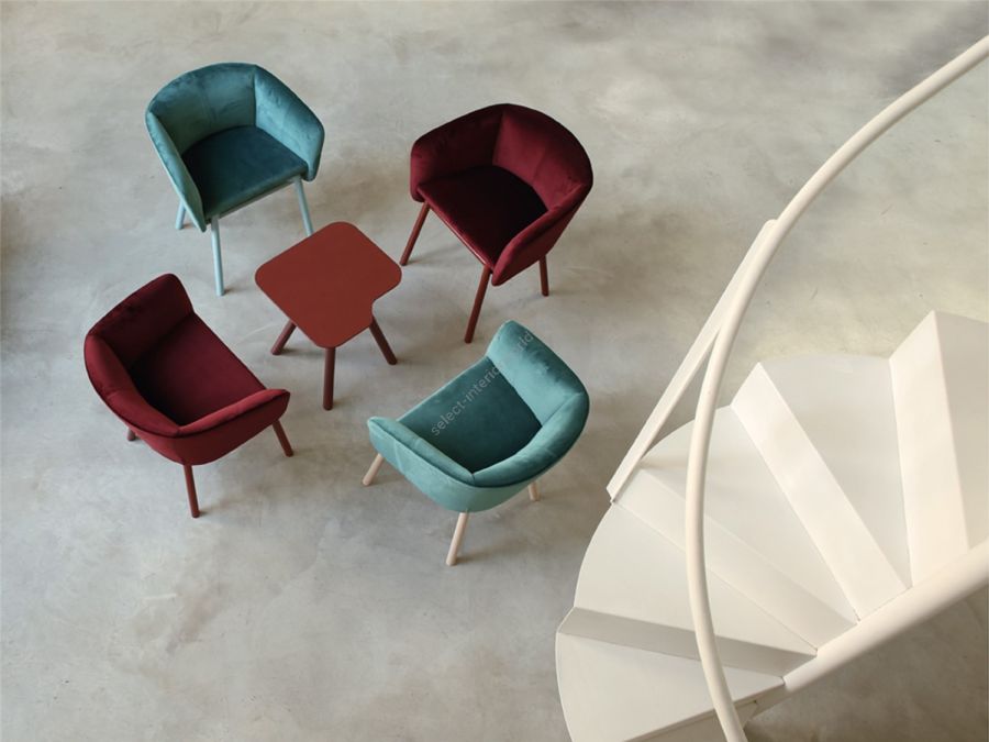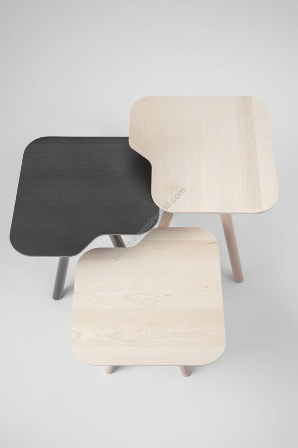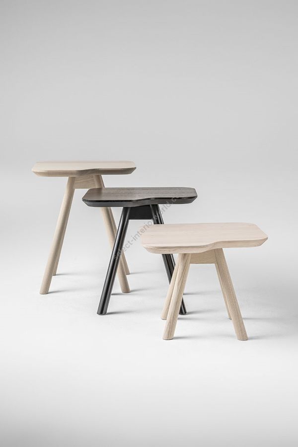 A collection of coffee tables with an irregular, rounded top and trestle legs reminiscent of the archetypal table. The Aky Small Tables enrich the living room area with a pleasantly minimal look, featuring calibrated dimensions and striking textures. The colour range comes in different finishes: natural ash, bleached ash, cocoa-stained with an open pore finish, and new colour combinations in pastel shades. The top is in ash-veneered MDF, and the frame in solid ash. The collection includes various shapes, sizes and heights.The AKY coffee table collection is enriched with a new variant that combines the rounded and irregular imprint of the top - in addition to the classic round wooden trestle legs - with metal legs, more slender and slender, which renew their impact.