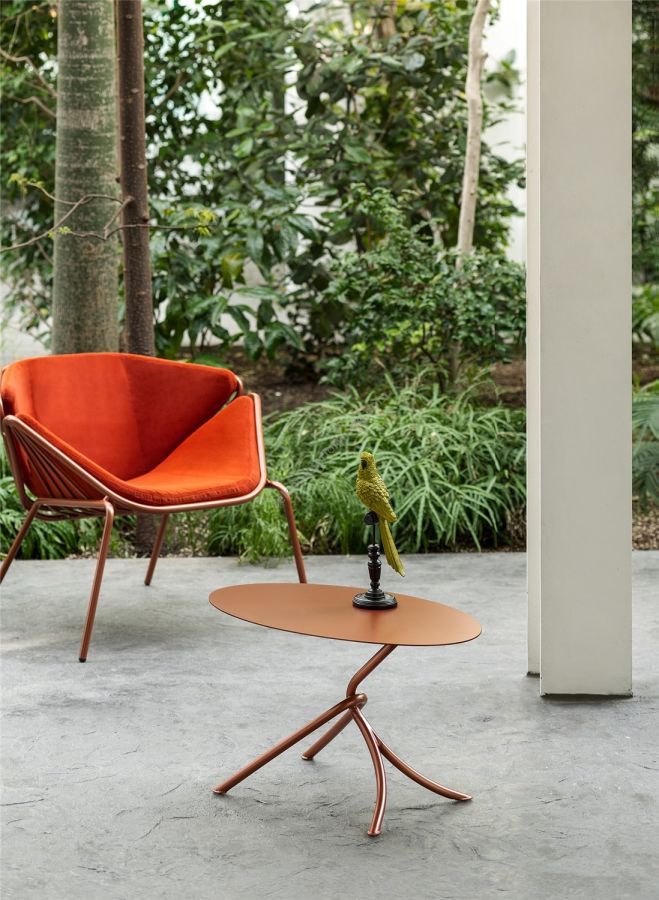The harmonic, enveloping shells in powder-coated tubular metal that define the Skin armchair - designed by Giacomo Cattani - evolve and transform to compose a true collection.A chair, a stool, two tables, a low one and a high one, and the ever increasing range of colours available breathe life into a collection of furniture that fosters chatting and relaxation; welcoming, geometric patterns designed to meet the requirements of contemporary projects geared more and more towards a mix of indoor and outdoor.The play on colours - a plus point that defines the Trabà production - can be stressed by the countless options open when it comes to the shades and fabrics of the body: a wide selection for indoor and outdoor environments, eco-leather for creating fun tone-on-tone seats or bolder contrasting colour effects.Skin, perfect for adding a touch of personality to sophisticated residential and contract projects: like a second skin for gardens, patios, terrace-bars, verandas and bow-windows.