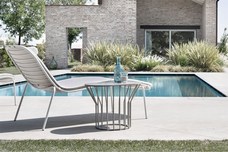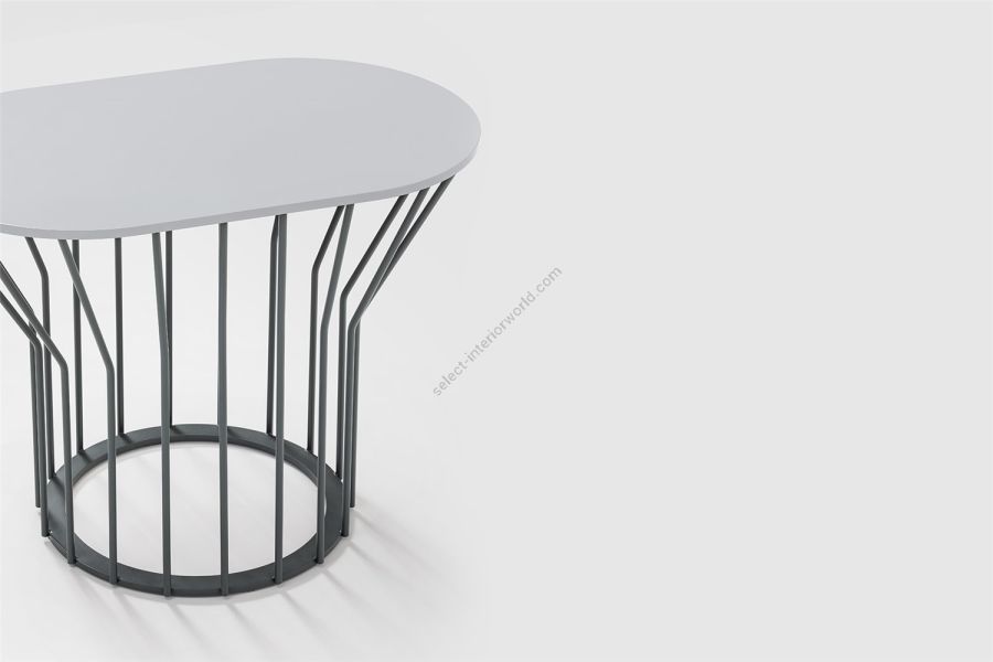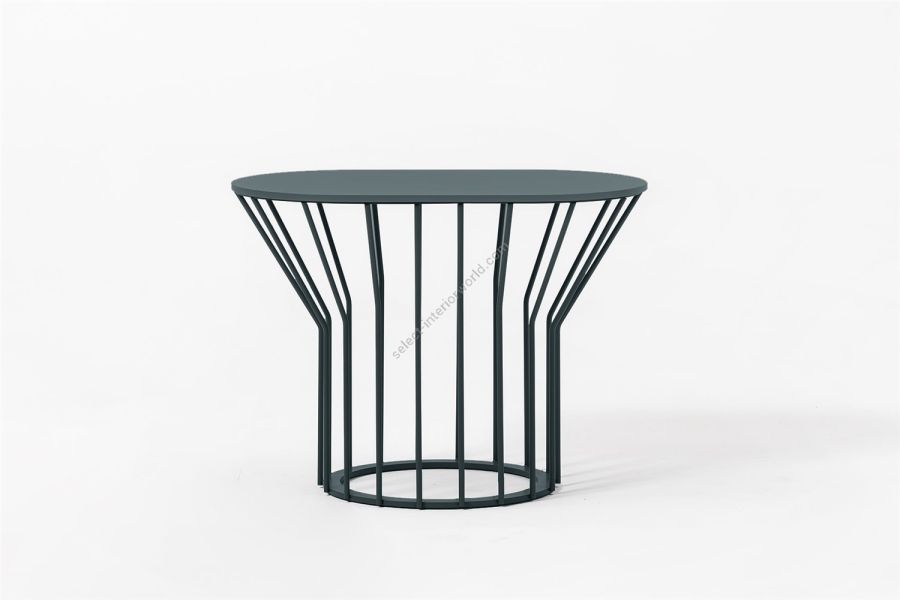 A collection of coffee tables with an original coloured metal base: equidistant spokes either extend straight up from the circular base or bend and open outwards, creating a distinctive design and movement. Oval or round tops can be made of HPL, marble or glass ceramic and can be combined with different bases, depending on their shape and size. Jump Little Table is also available in an outdoor version that brings practicality, style and colour to the garden or poolside.