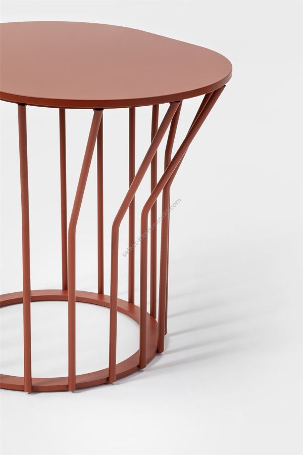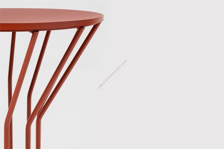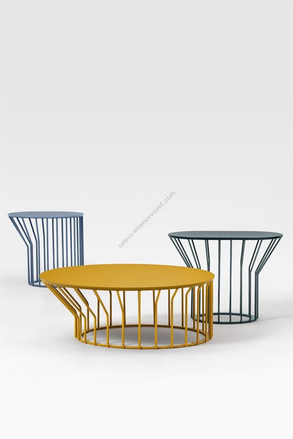 A collection of coffee tables with an original coloured metal base: equidistant spokes either extend straight up from the circular base or bend and open outwards, creating a distinctive design and movement. Oval or round tops can be made of HPL, marble or glass ceramic and can be combined with different bases, depending on their shape and size. Jump Little Table is also available in an outdoor version that brings practicality, style and colour to the garden or poolside.