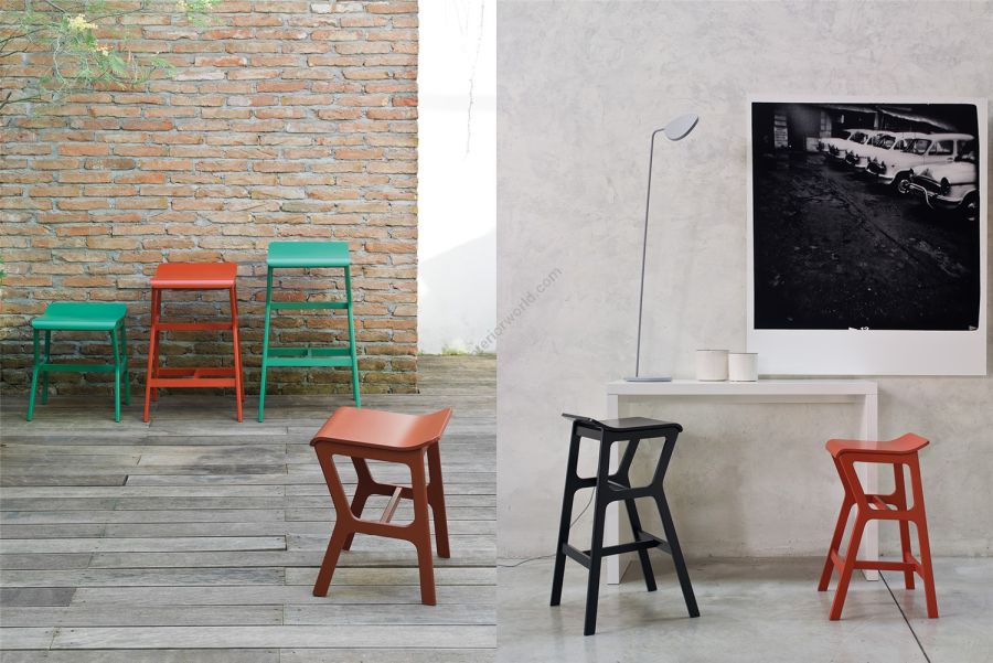 Asymmetrical in design, the Nhino stool seems almost to dance, to move, inviting users to socialise and share. Nhino is available in three different heights - 82, 72 and 53 cm - and is perfect for breakfast in the kitchen, for dinner in the dining room, or for afternoon tea and coffee in the living room. This versatile seat is also suitable for public areas, especially in casual venues such as lounge bars or fast food joints. The highest version is idea for an aperitif at the bar counter.The frame, with rounded edges, is in beech, while the seat is in beech plywood. Nhino comes in various finishes: bleached, stained in natural tones such as cocoa or tin grey, or lacquered in bright colours such as red, yellow, orange, and many more besides.