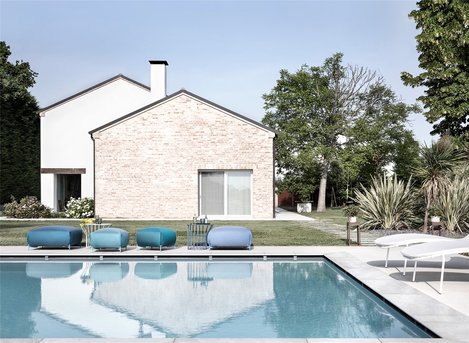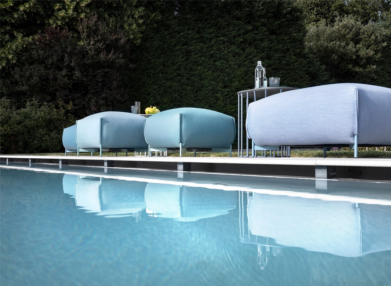 Available in two sizes, Mochi Pouf is the perfect comfort and style accessory for indoor and outdoor spaces. Its generous shape and plump padding are supported by slender painted metal feet and covered with fabric, leather, eco-leather or velvet. It can be used individually in an informal corner or to extend the comfort of a sofa, or in colour-coordinated multiples to create an island of relaxation.