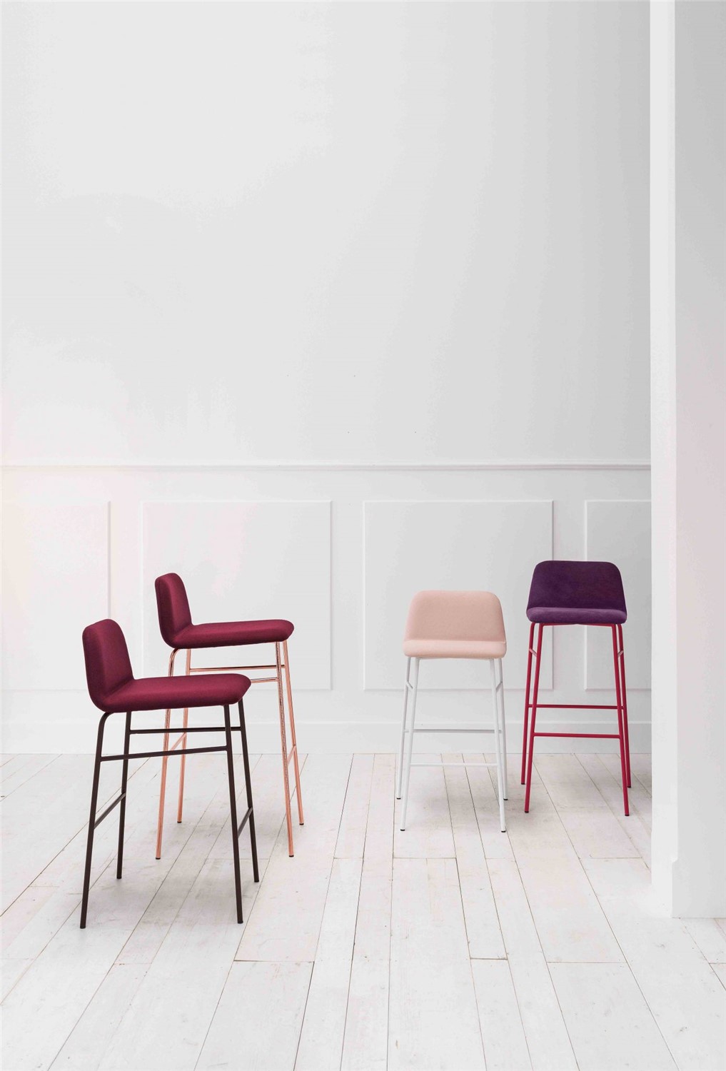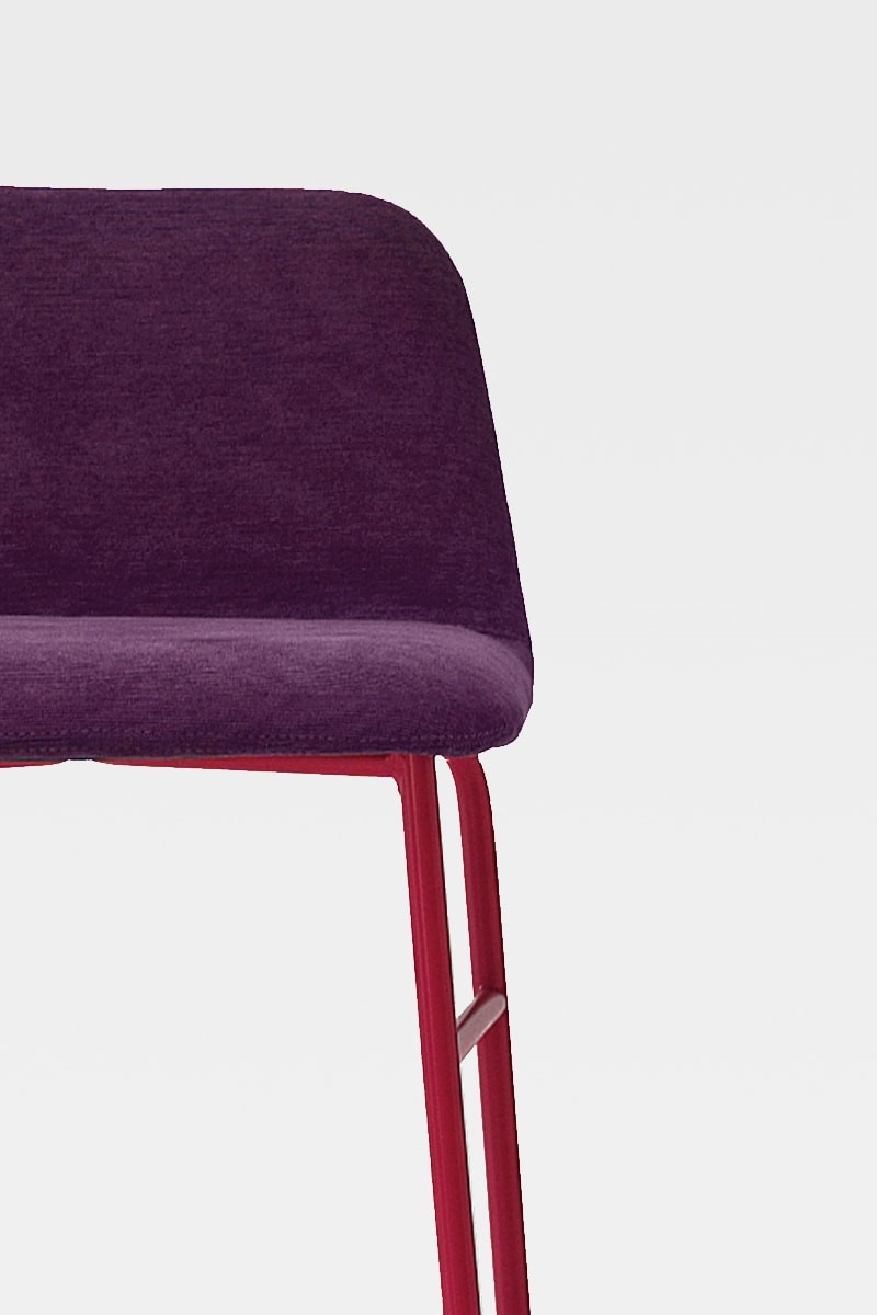 Always in line with the 1950s, here is the new version of Bardot with structure and legs in lacquered metal in different colors. The overall vision created by the harmony of the rounded shapes, the full volumes and the soft but minimal design is recreated in a more rock, metallic version, thanks to the structure that lightens the seat. A wide range of colors for the upholstery, upholstered in velvet, or leather or eco-leather, makes it suitable for both the home, kitchen, dining room, study, and contract environments. A transversal proposal to create welcoming domestic settings or furnish contract spaces. The Bardot family expands and is enriched by a stool with 4-leg metal structure and footrests alongside an accommodating and round seat. Perfect for use in both public environments and private contexts, from the kitchen to the dining and living areas.
