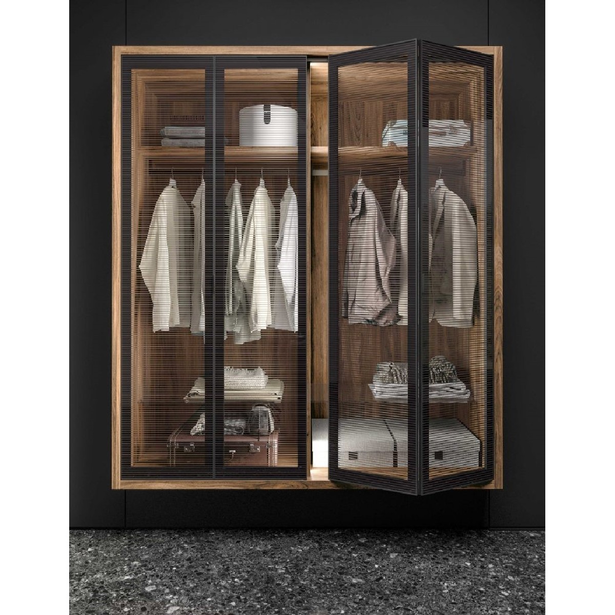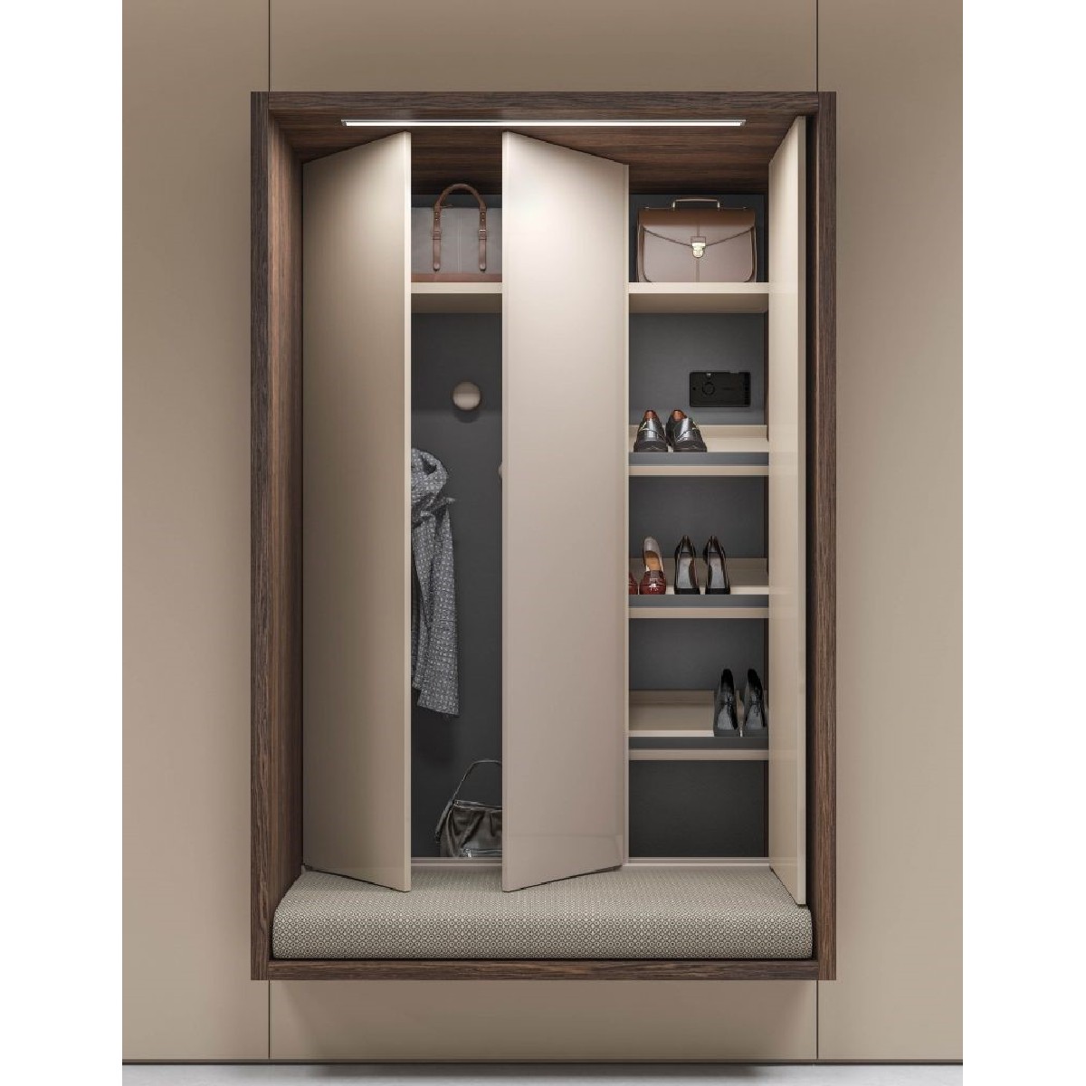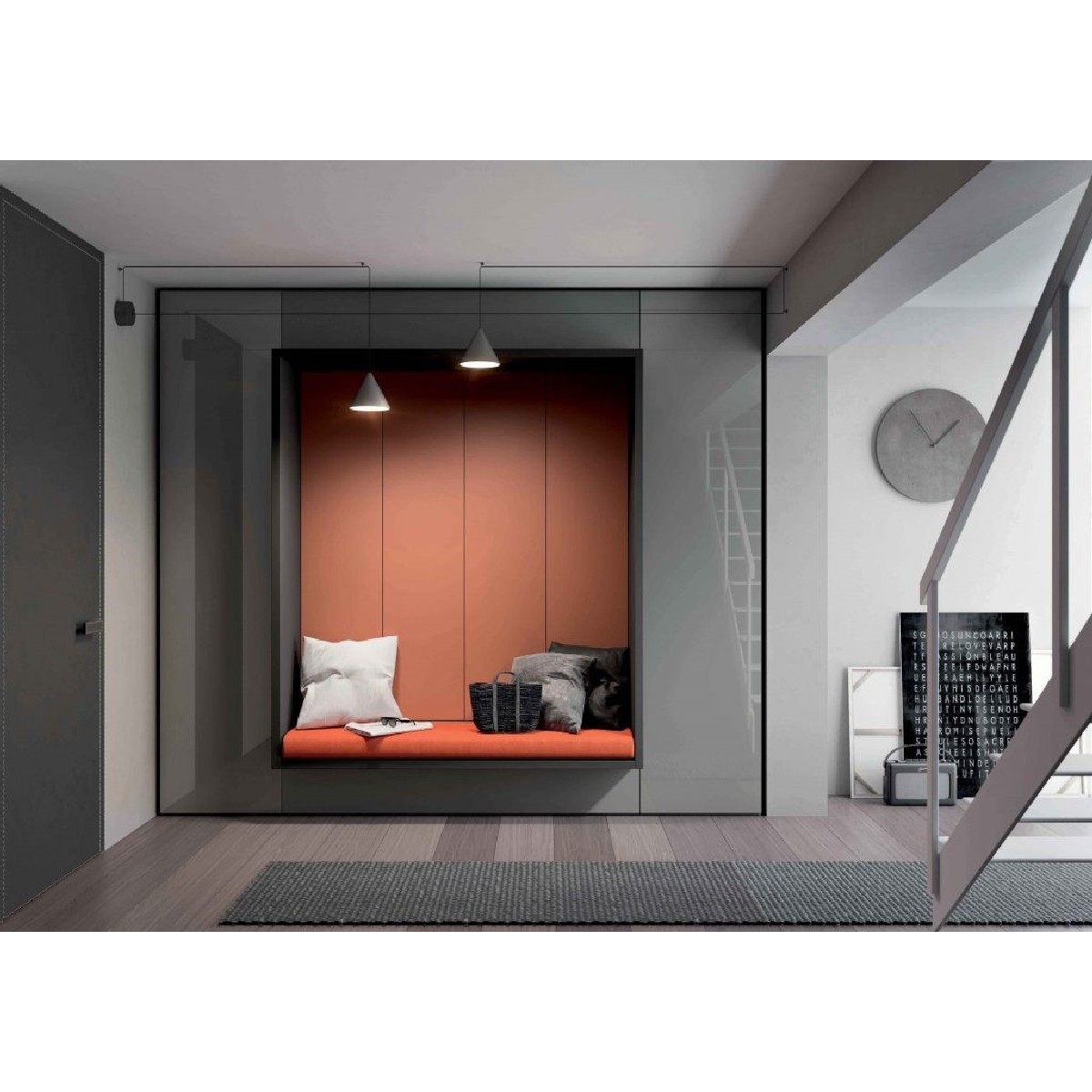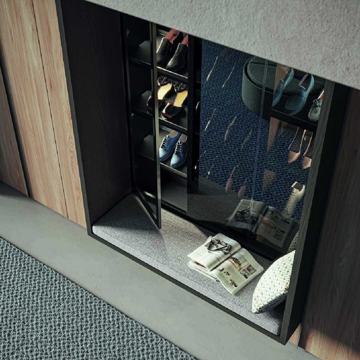Besides the seat and murphy bed version, there are further design configurations: it is possible to set it up in the same seat version but with wardrobes behind, supplied with several internal accessories, or with hinged or folding glass doors wardrobes or open bookcase, with or without seat.