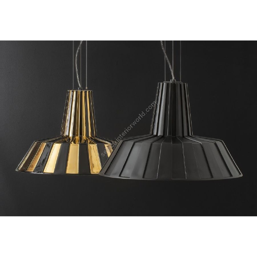 Design suspension lamp in ceramic pendants with reflecting inner reflector. The series is available in solid color or with an original striped finish. The suspension, both for its size and for processing, becomes an original piece of furniture, with a strong personality, which certainly doesnt go unnoticed. Its is equipped with cables in stainless steel, which allow height adjustment at time of installation.
