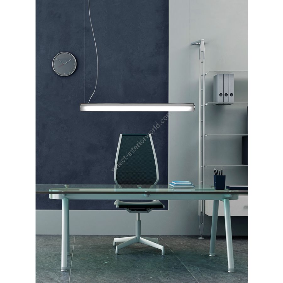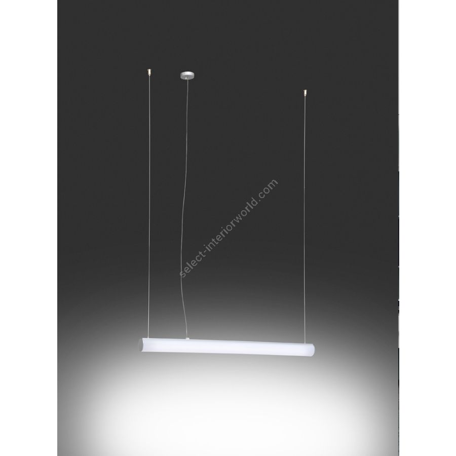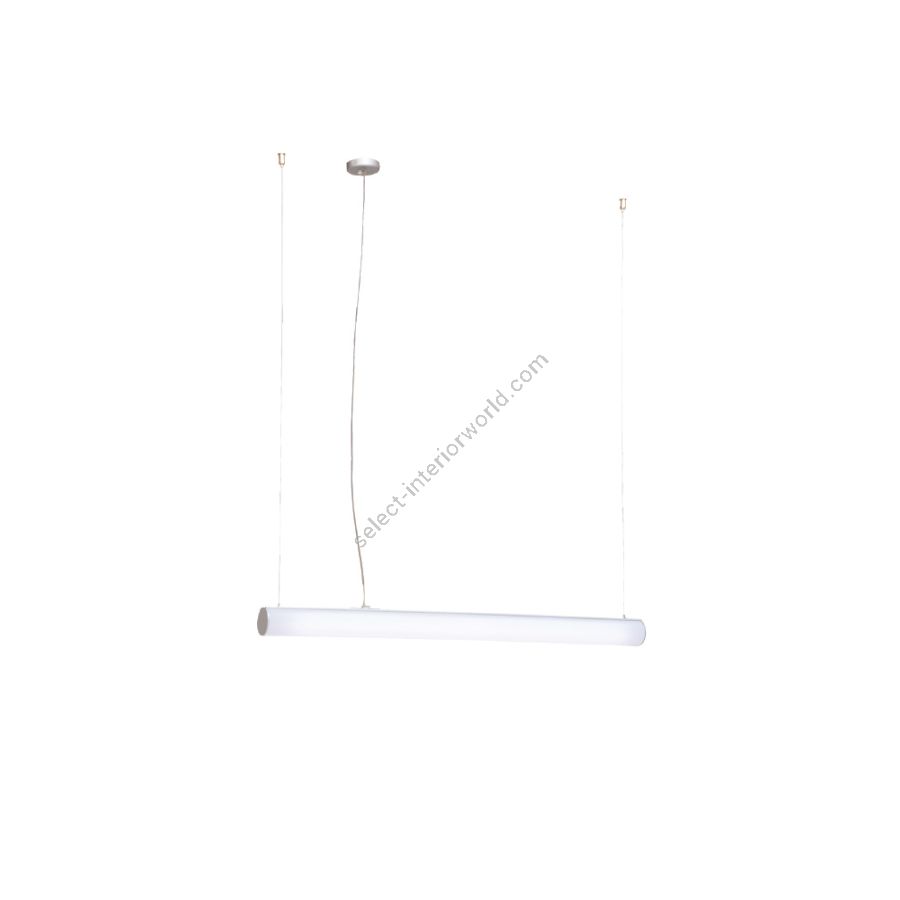 The collection has two models, which, in reality, are three in practice: one that serves as both a ceiling lamp and as a sconce, and the other is a pendant. The cylindrical shade has a diameter of 8cm, is made of opal polycarbonate and is available in three lengths: 60, 90 and 120cm. The structure is made of textured painted iron in two finishes to choose: white and silver. The light source is an integrated LED strip 230V 2700K CRI>80 dimmable by TRIAC, with power and luminous performance depending on the length of the lamp: 14W 1350lm for the length of 60cm; 22W 2160lm for 90cm and 30,8W 2970lm for the one of 120cm.