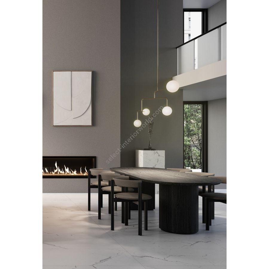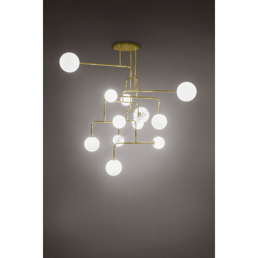 CONSTELLATION is a collection inspired, on the one hand, by the mobiles developed by Alexander Calder and Joan Miró, created almost simultaneously with identical name, without them knowing each other, each in their own area: Calder in sculpture and Miró in painting. On the other, CONSTELLATION is also inspired in the fascination caused by the constellations of the Cosmos, the stars, their balance and beauty. CONSTELLATION is a stunning and asymmetrical luminaire that maintains, despite its complex configurations, a perfect balance, giving a dynamic sensation to the space in a constant change, depending on the observer's point of view. A thin metal tube draws a structure that ends in blown glass spheres of three different diameters, that dissipate the light in a soft and warm manner. CONSTELLATION provides a stylish touch between 'Art-Déco’ and Mid-century.