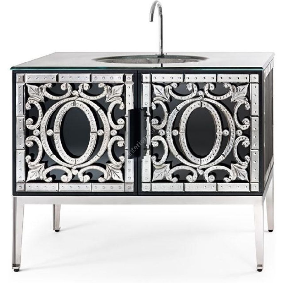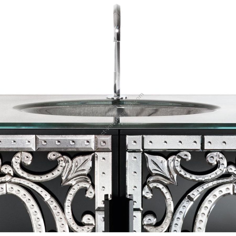 Molten hand basin top made of medium antique mirrored glass. Doors made of bevelled and engraved glass with medium antique mirrored finish.