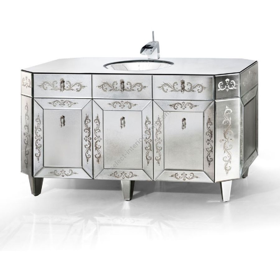 Molten vanity top made of medium antique mirrored glass. Doors, drawers and sides made of bevelled glass with medium antique mirrored finish.