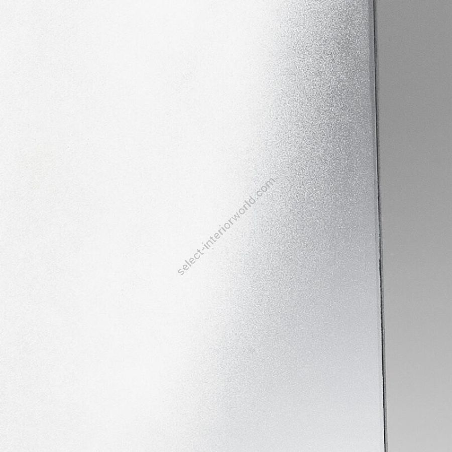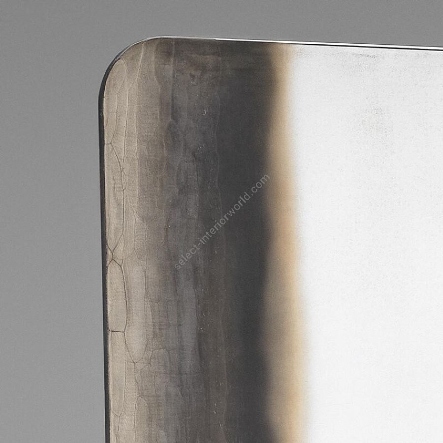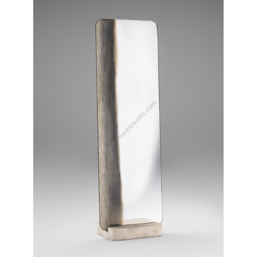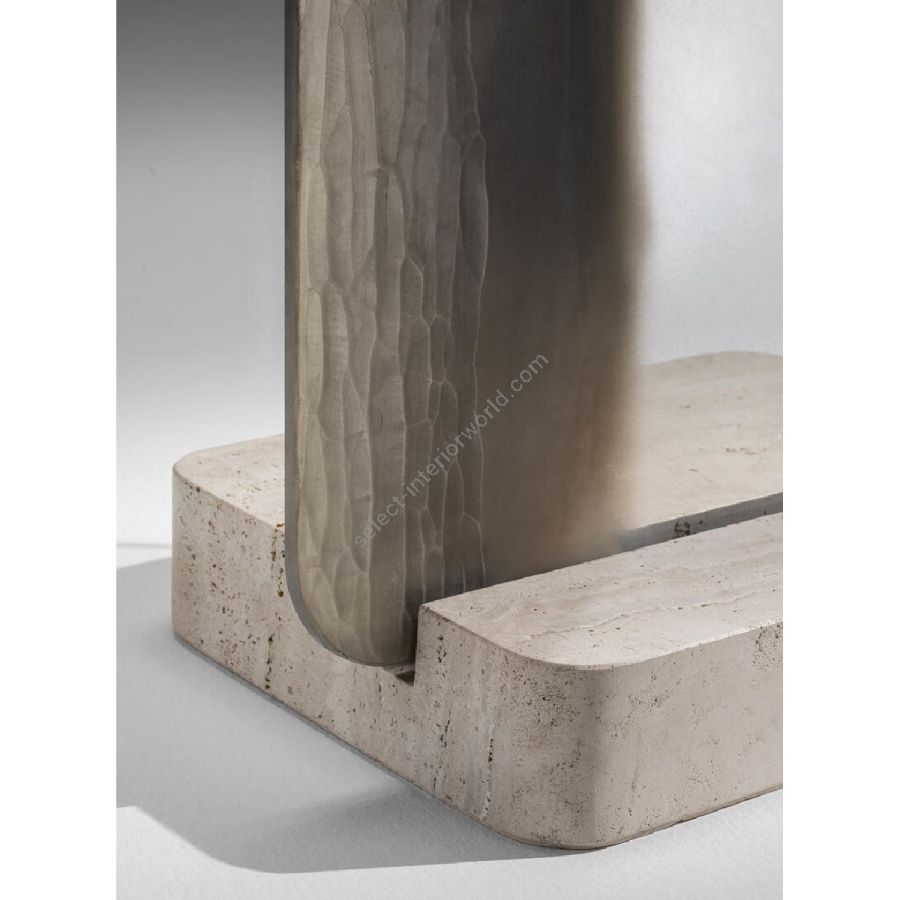 Glass edge decorated with Roddi finish and partially mirrored. Base in Travertino marble.