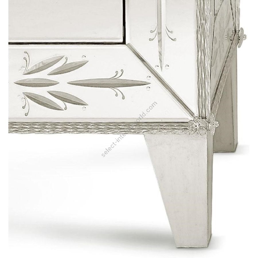 Three doors with pull handle and soft-close system. Top, doors, sides and back made of clear mirrored glass. Frames made of bevelled and engraved glass with clear mirrored finish.