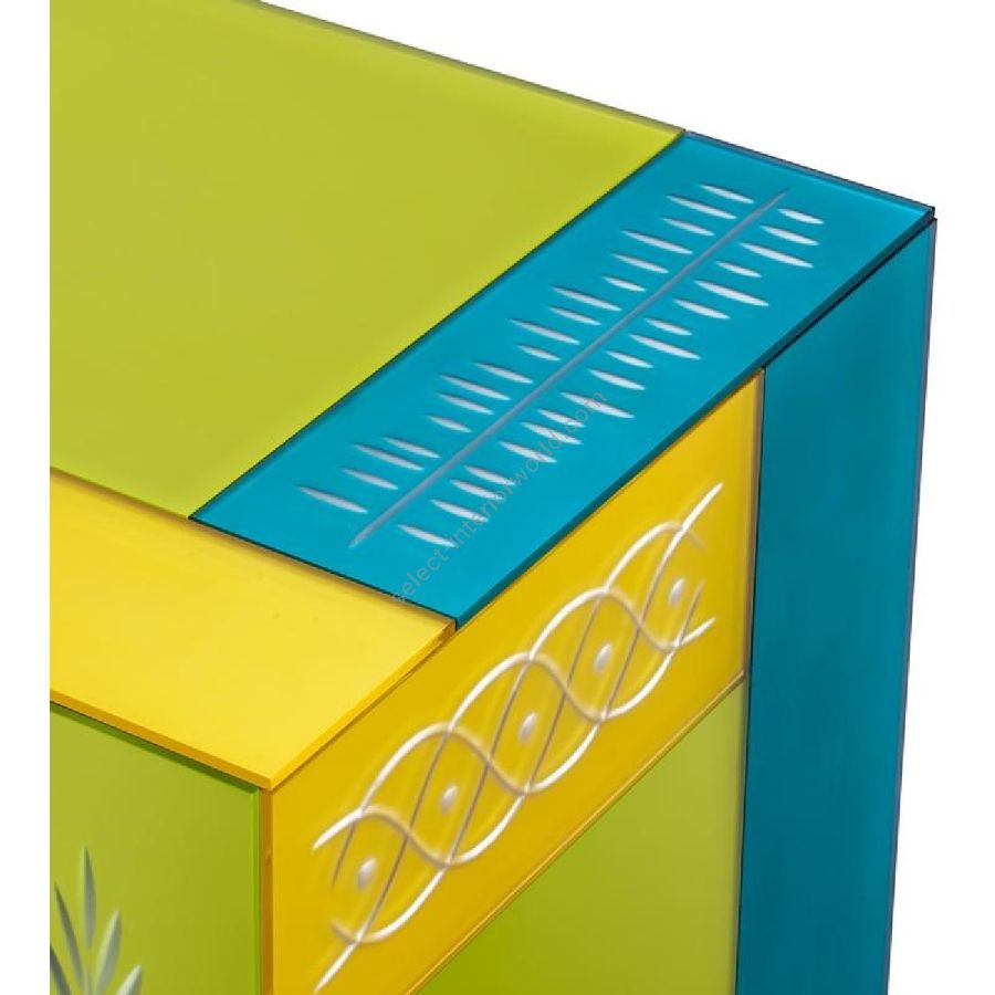 Extra-clear acid etched glass coating, 6 mm thick, varnished in multicolour and decorated with silver hand engravings. Coloured and borosilicated, silvered glass legs.