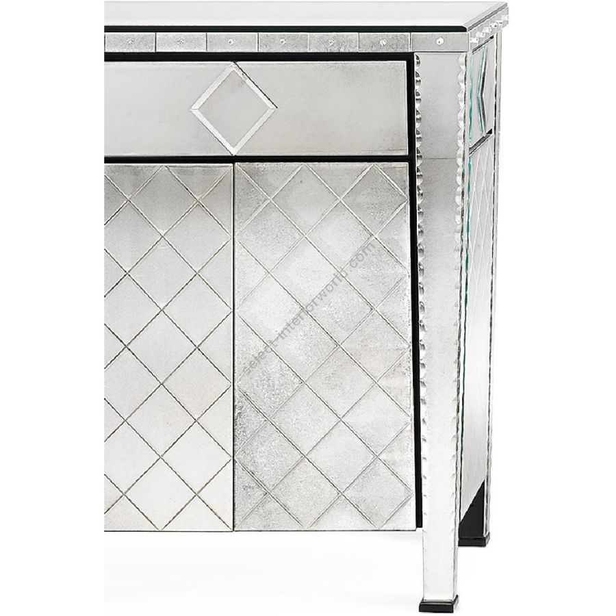 Top made of glass with hand silvered and antiqued finish. Back side made of laminate with satin aluminum finish. On the inside: black matte lacquered finishing and one adjustable shelf made of glass with hand silvered and antiqued finish.