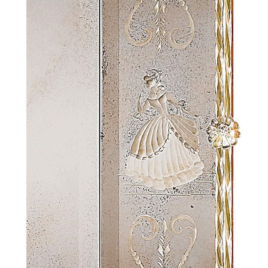 Floral motif and the depiction of a Venetian couple featuring a Lady and a Gentleman engravings. Decorative gold and crystal colour rosettes and twisted ropes made of Murano glass.