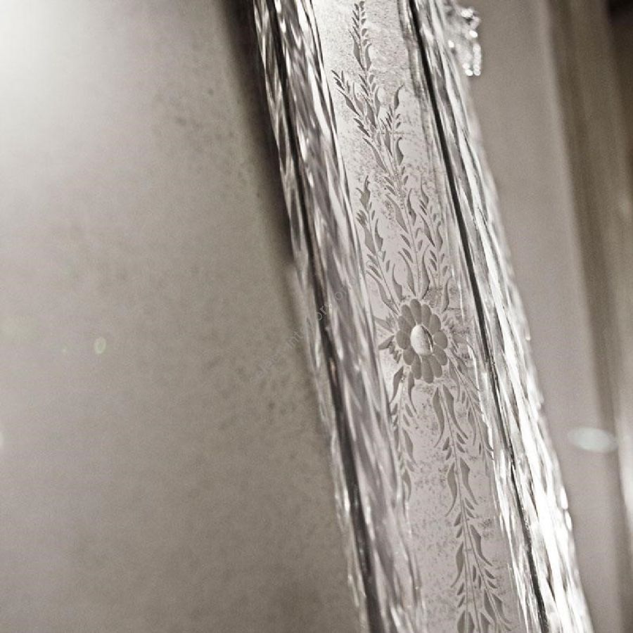 The most famous characters are the typical engraved curl finishings together with the depiction of Bacco, Justice or the well-know Venetian Eighteenth-century. Crystal colored Murano decorative flowers, leaves, twisted ropes and multicoloured glass paste rosettes embellish each Venetian mirror. The result is a unique item comparable to a work of art for craftsmanship and excellence in its execution.