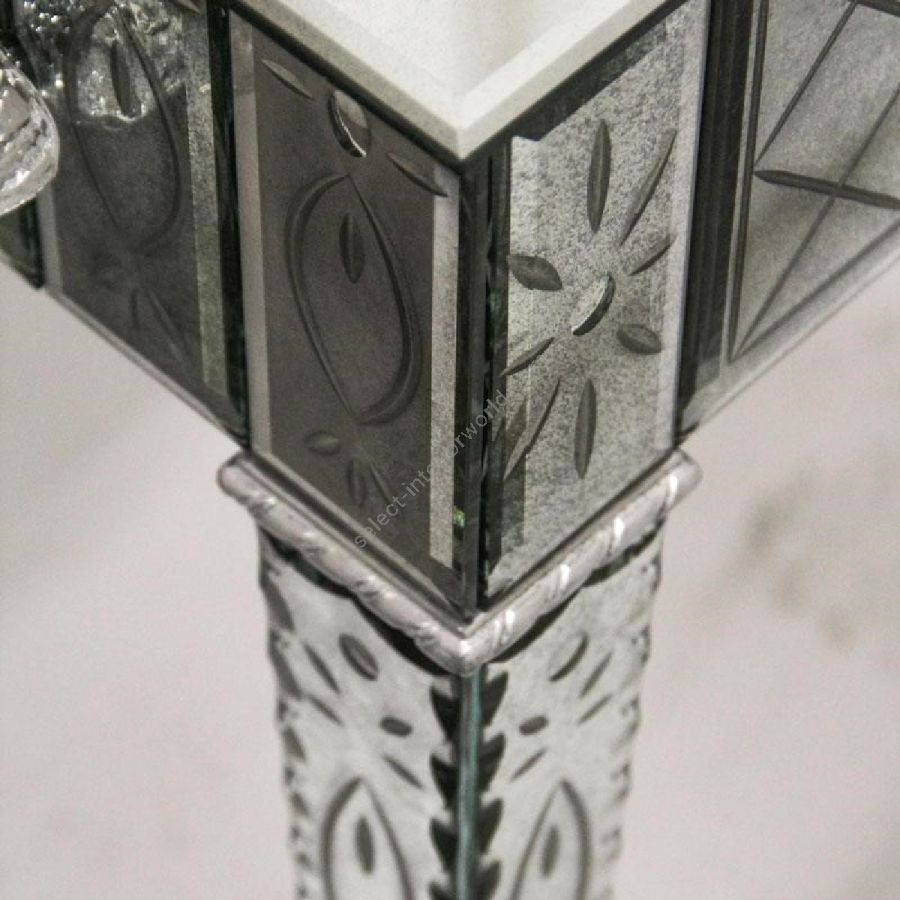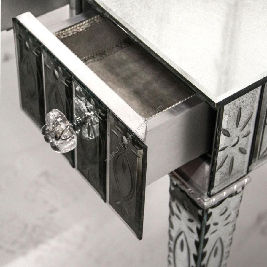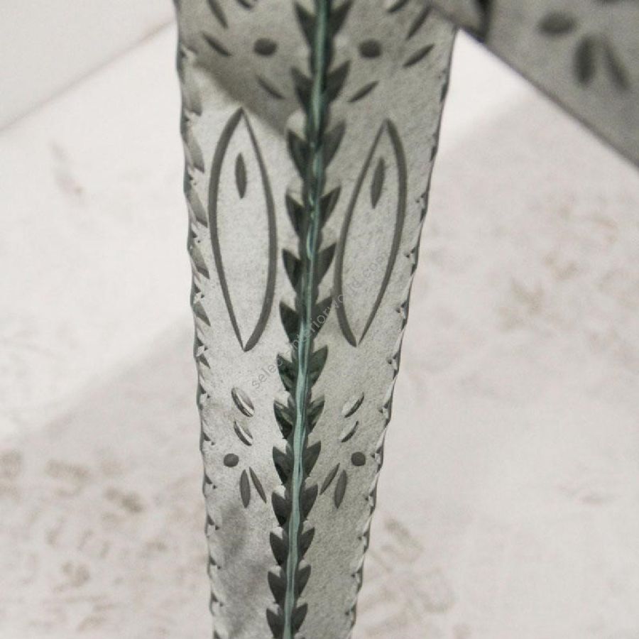Shaped top made of bevelled glass with medium antique mirrored finish. Front, sides and legs made of engraved glass with medium antique mirrored finish and with thumbnail-shaped etchings.