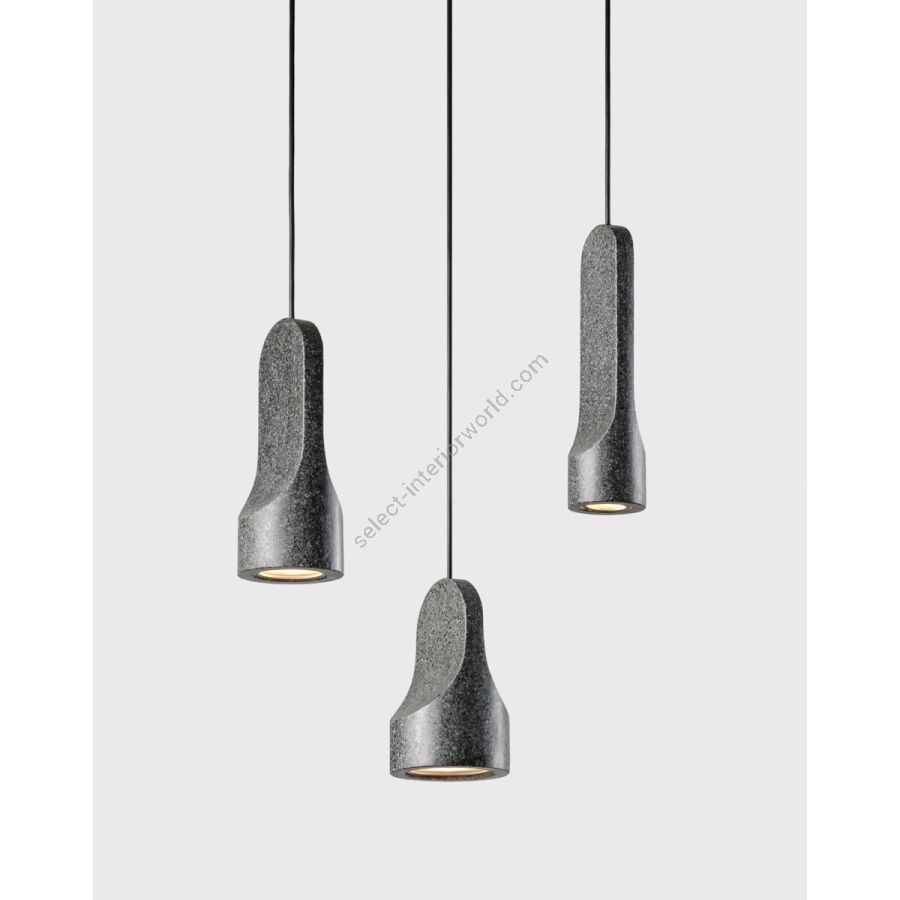 Stone and light, two opposing elements that Parga unites in the search for an almost fictional image. The energy contained within a mineral seeks to be released and radiate out in an intense beam of direct light. Parga is a collection that goes back to using granite for functional and decorative in indoor spaces, taking advantage of its neutral color palette and natural texture. This lamp is made from three pieces of different heights and diameters, each with a formal language reminiscent of the most primitive and rudimentary stone carvings. The material used is discarded pieces of granite mined from Galician quarries, making for a more sustainable use of materials. The granite forming Parga is compact, light gray in color and uniform with specks of black and fine grain.