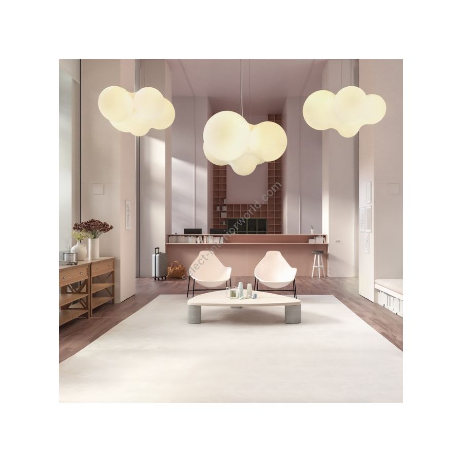 Cloudy bridges design and art, creating a striking light sculpture. Five asymmetrically arranged spheres, wrapped in semi-transparent fabric, evoke the softness of a floating cloud. More than a pendant lamp, it harmonizes form and diffused light, becoming a dynamic, poetic focal point in any space.