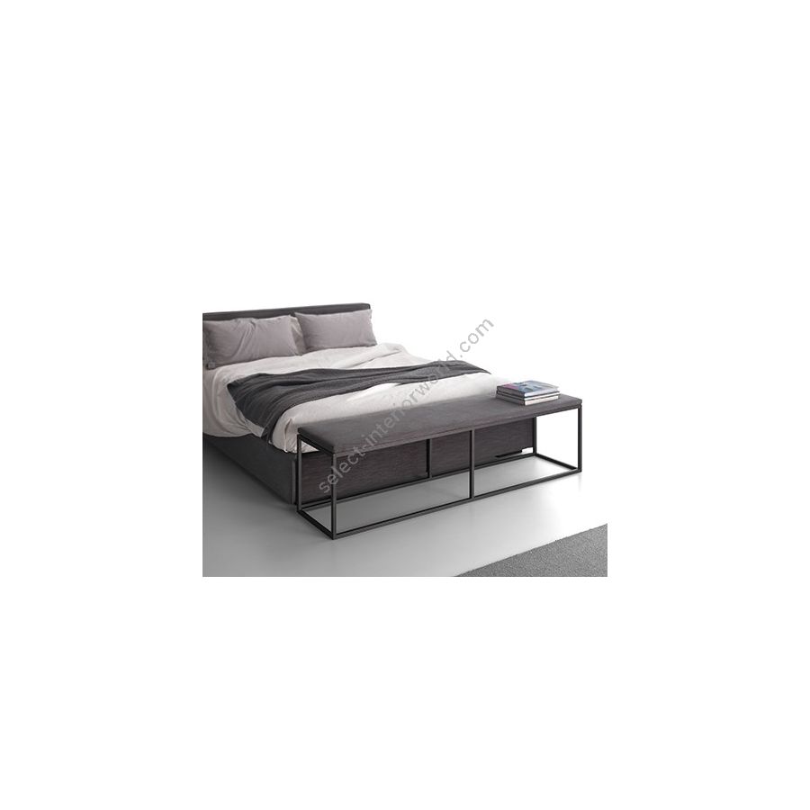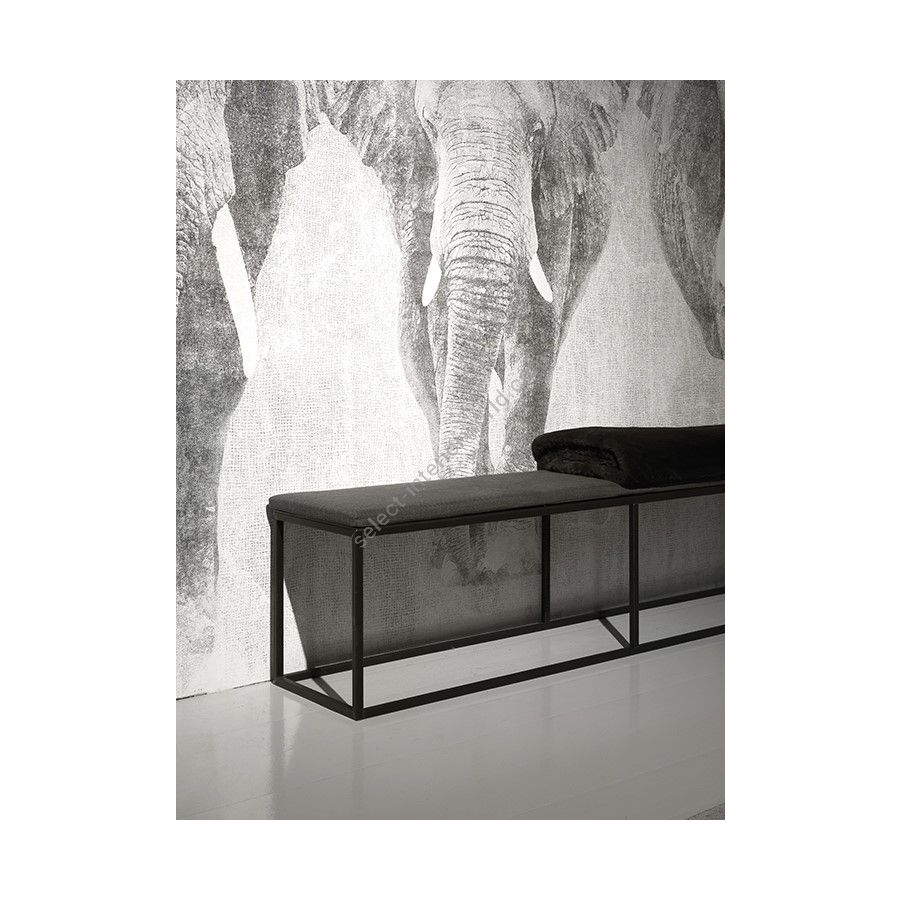 The Olivia bench highlights the simplicity and sophistication of the design of this complement. The structure is made of stove-enamelled iron in burnished, matt black and dark brown finishes. The cushion can be made of fabric or leather.