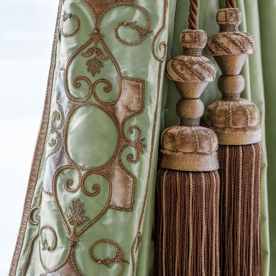 The Imogen tie back is a design of wonderful exotic shapes, featuring exquisite gold binding and fine embroidered gadroons.