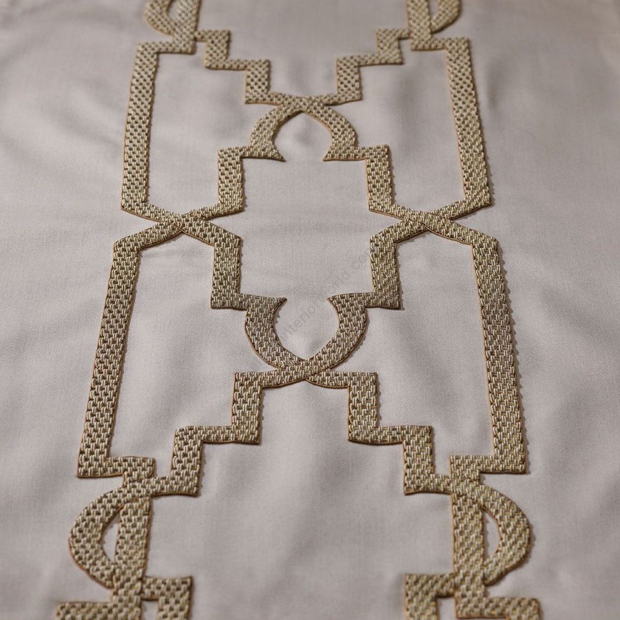 Aida is a beautifully geometric design, inspired by the Alhambra Palace in Granada. A simple yet chic leading edge. Our Couture fabrics are bespoke and hand embroidered to order. They can be created in fine gold or silver silk thread and embellished with freshwater pearls and semi-precious stones. Each pattern can be coloured and designed to fit your needs. We can embroider onto any background fabric including: silk, velvet, organza and leather.