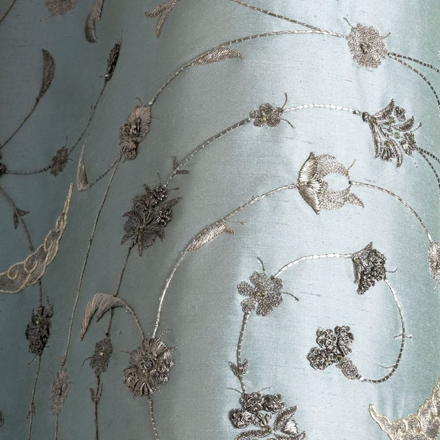 Our Couture fabrics are bespoke and hand embroidered to order. They can be created in fine gold or silver silk thread and embellished with freshwater pearls and semi-precious stones. Each pattern can be coloured and designed to fit your needs. We can embroider onto any background fabric including: silk, velvet, organza and leather.