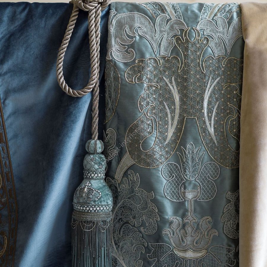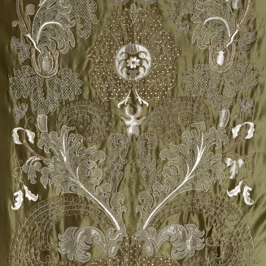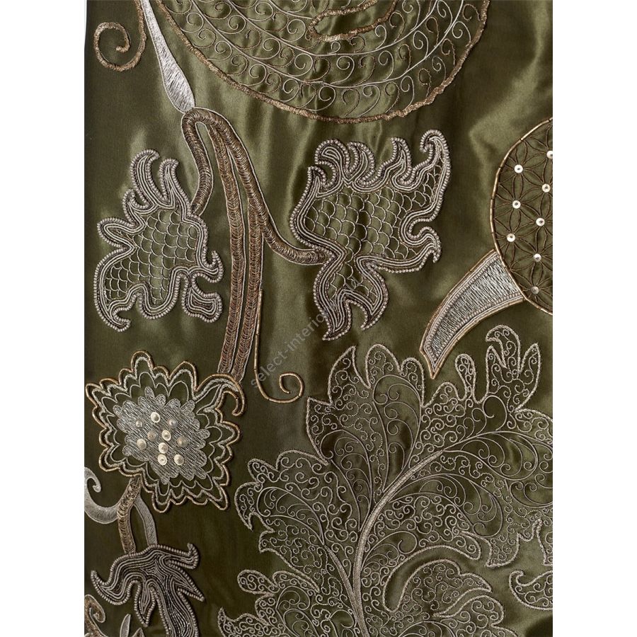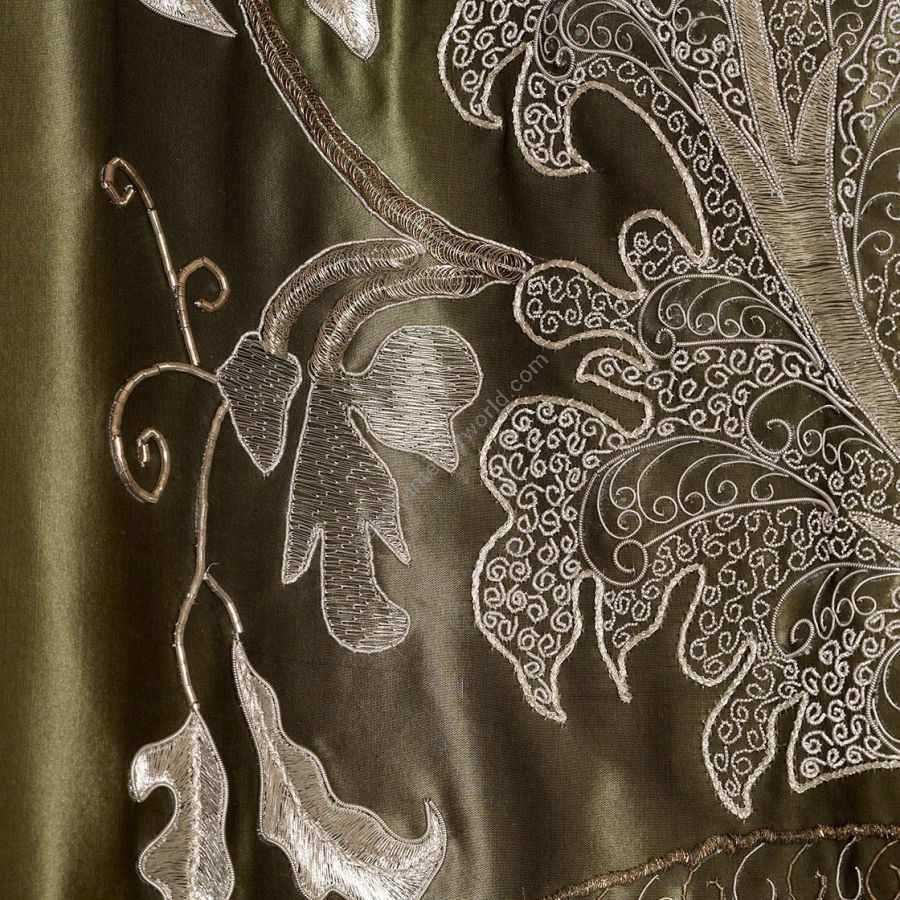A dramatic baroque design, Caligari is illuminated with delicate filigree embroidery in striking gold and silver threads.