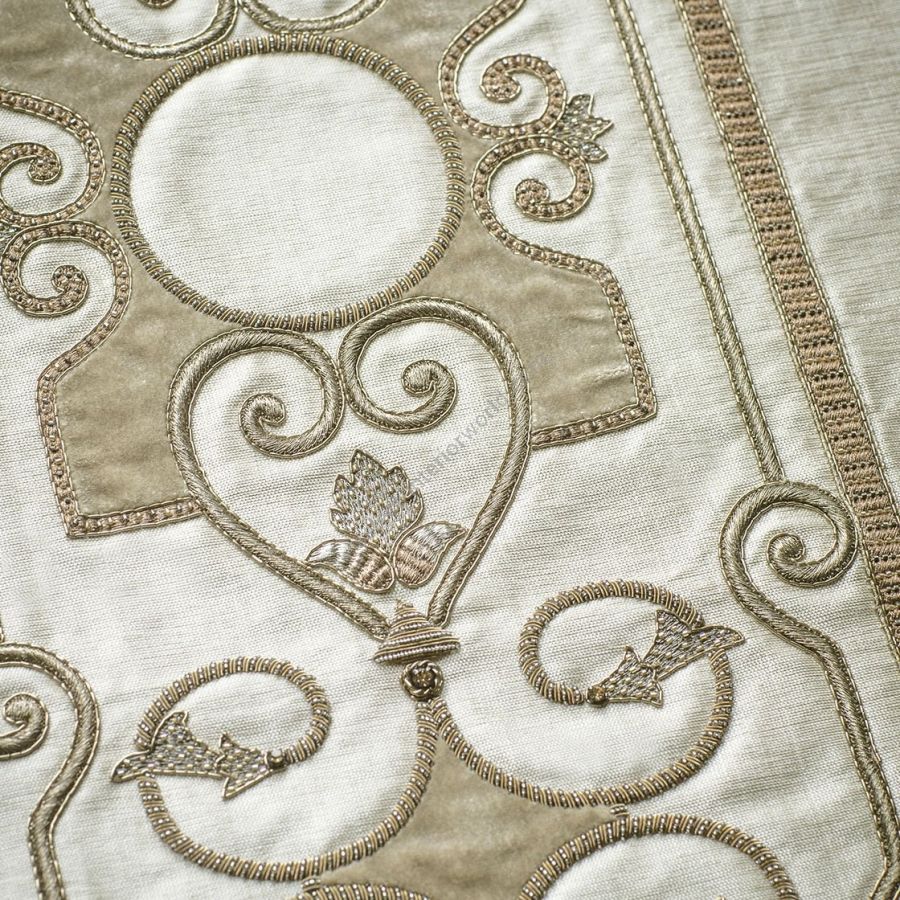 Our Couture fabrics are bespoke and hand embroidered to order. They can be created in fine gold or silver silk thread and embellished with freshwater pearls and semi-precious stones. Each pattern can be coloured and designed to fit your needs. We can embroider onto any background fabric including: silk, velvet, organza and leather.