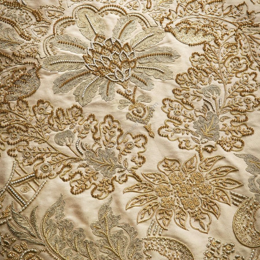 Our Couture fabrics are bespoke and hand embroidered to order. They can be created in fine gold or silver silk thread and embellished with freshwater pearls and semi-precious stones. Each pattern can be coloured and designed to fit your needs. We can embroider onto any background fabric including: silk, velvet, organza and leather.