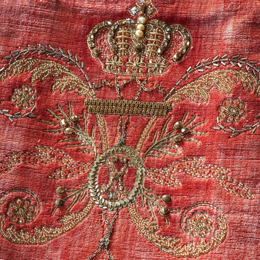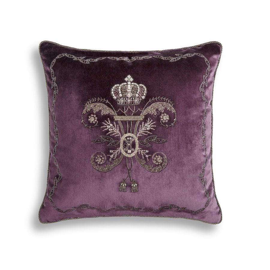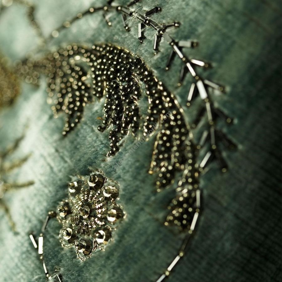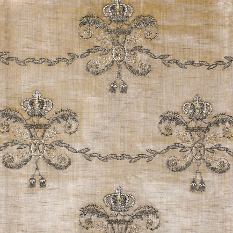 Imperatore is a design reminiscent of the Royal Crest, featuring a small ornate crown atop crossing tassels. Its strong interlinking pattern is embellished with antique silver thread, crystals and pearls.