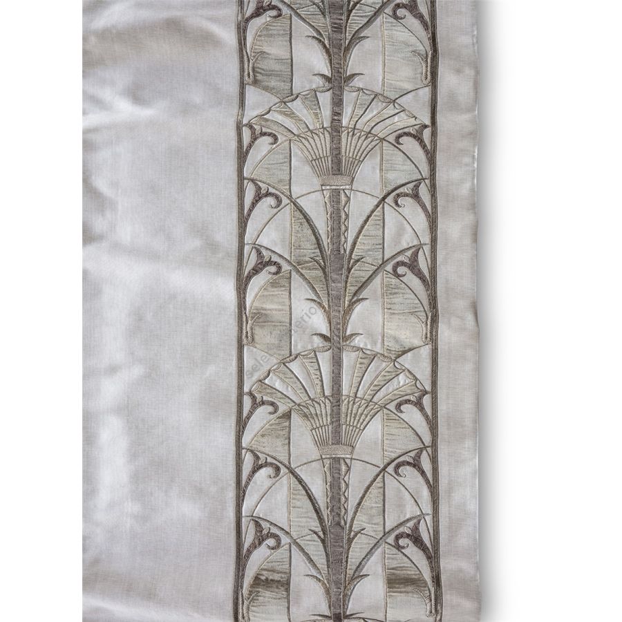 Evoking bold, decorative 1920s modernism, Montano has an elegant framed panel made up of geometric shapes and a fan, an iconic motif of that era, all appliqued in velvet and contrasting silks.