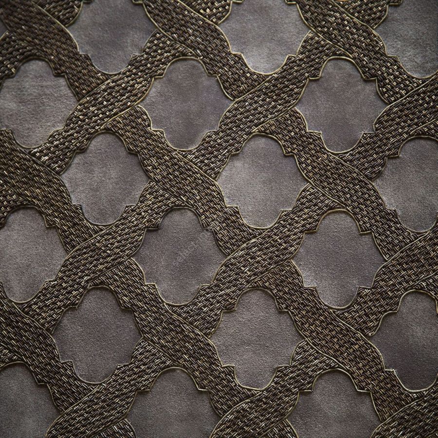 Otello is a trellis design, reminiscent of the patterns used in Moorish architecture. Its bold embroidery uses a chain mail technique in thick antiqued silver and gold threads.