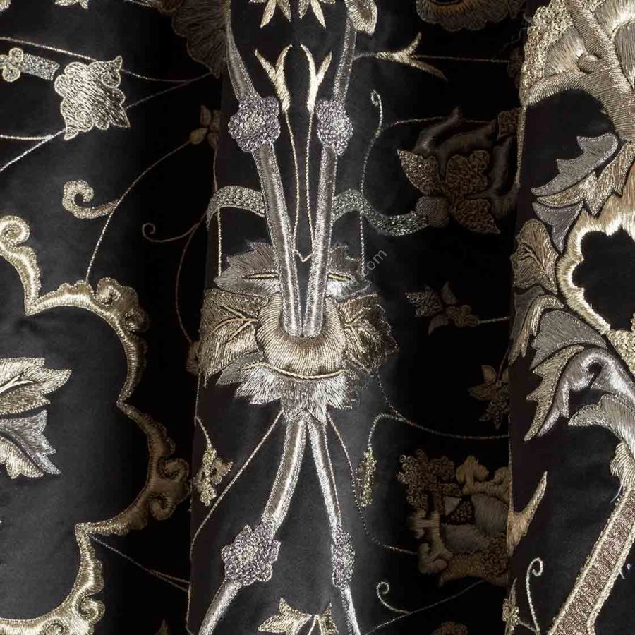This richly detailed design is influenced by complex patterns from 17th century Ottoman tapestries. The large scale stylized motifs are highlighted using a variety of techniques and metallic threads.