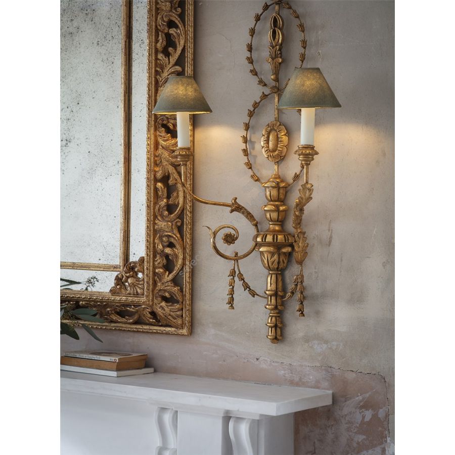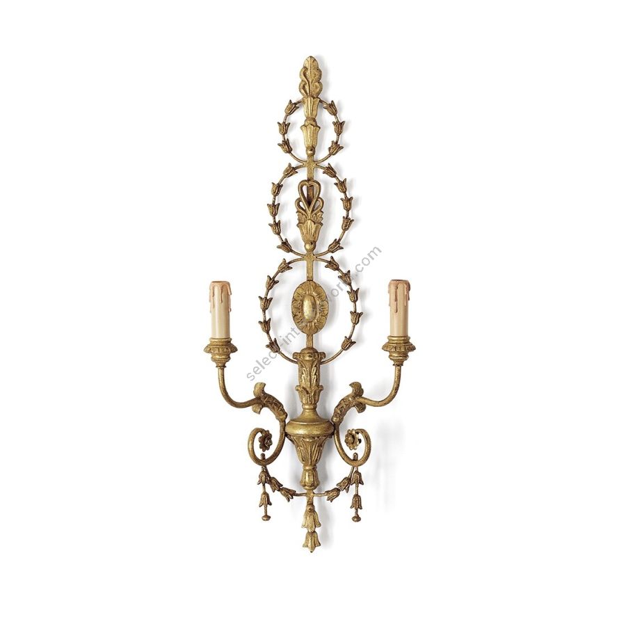 The Adam design has a giltwood and metal neo-classical style. A very elegant 2 branch wall light, with delicate scrolls embellished with acanthus leaves. Our lights are made by skilled artisans. The unique range of highly decorative lights is created by hand using traditional materials, carved wood, wrought iron, and gilding with subtle patination.