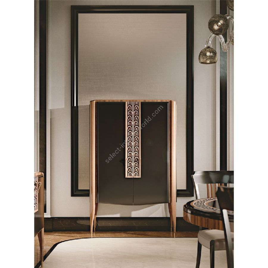 This elegant bar cabinet features a glossy black lacquered finish with exquisite polychrome inlaid woods, creating a striking visual effect. The handles, adorned with precious stones, add a luxurious touch, while the solid Canaletto walnut legs ensure stability and sophistication. Equipped with internal LED lighting, this cabinet is both a functional and decorative masterpiece. Designed by Ezio Bellotti, it exemplifies fine craftsmanship and artistic elegance.