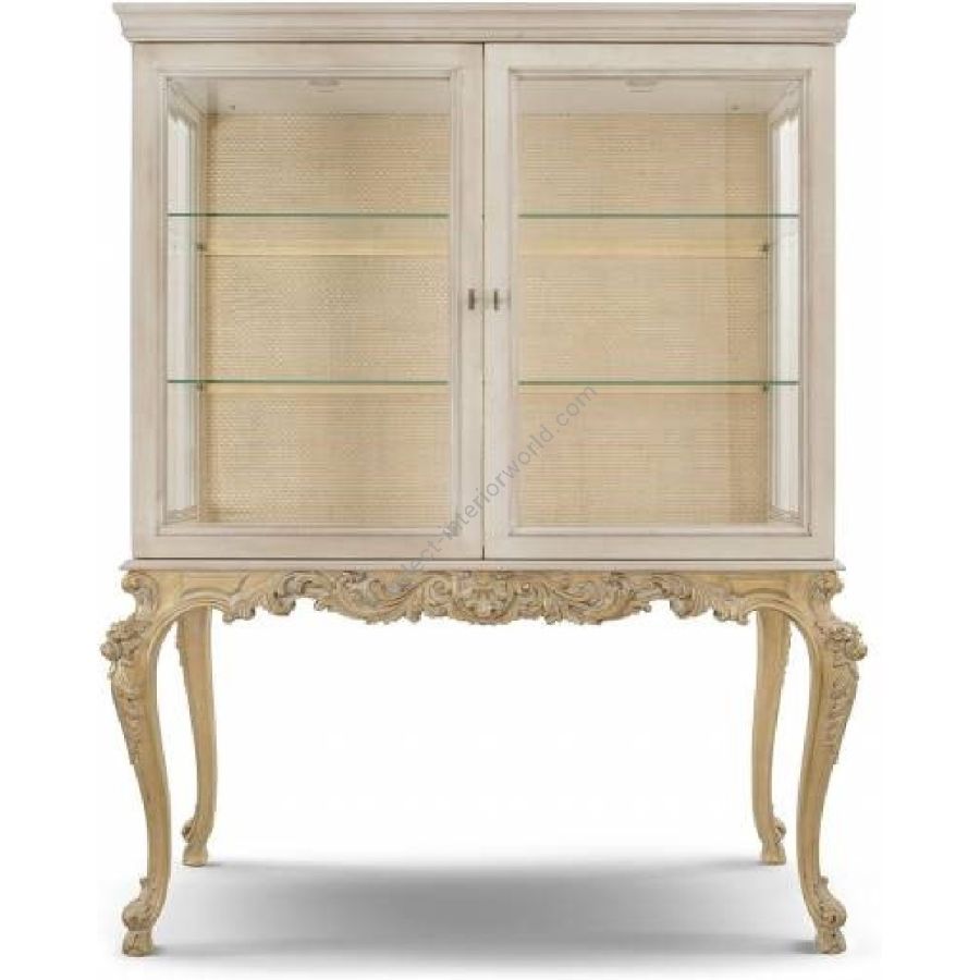 A perfect blend of functionality and aesthetics. The back panel of this glass cabinet is crafted from Rattan cane in an Oro Chic finish, beautifully enhanced by interior lighting that accentuates its rich tones. The cabinet stands on a finely carved wooden base, finished in OCH gold leaf with a patinated white meringue effect, adding a refined elegance. Designed by the Bellotti Ezio Team, this piece embodies exquisite craftsmanship and timeless beauty.