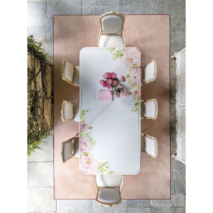 Delicate weaves characterize the Louis XV chairs accompanying the table, available with or without armrests. The fabric mirrors the finish of the Oro Chic structure, creating a harmonious and elegant design.