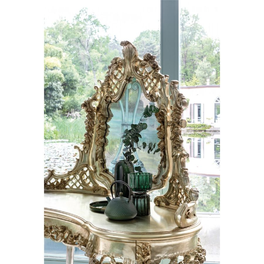 This dressing table with an incorporated mirror is a unique piece that brings character and elegance to any room, thanks to its intricate inlay work. Crafted from carved wood and finished with Silver Gold leaf, it combines timeless beauty with sophisticated craftsmanship. Designed by the Bellotti Ezio Team, this piece is both a functional and decorative statement, elevating the aesthetic of your space.