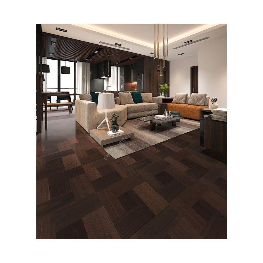 Orsati is a inlaid parquet with an intense and incomparable nuance of American walnut. The rigorous geometric design creates a wooden floor with an natural elegance. Product size 720x660 mm