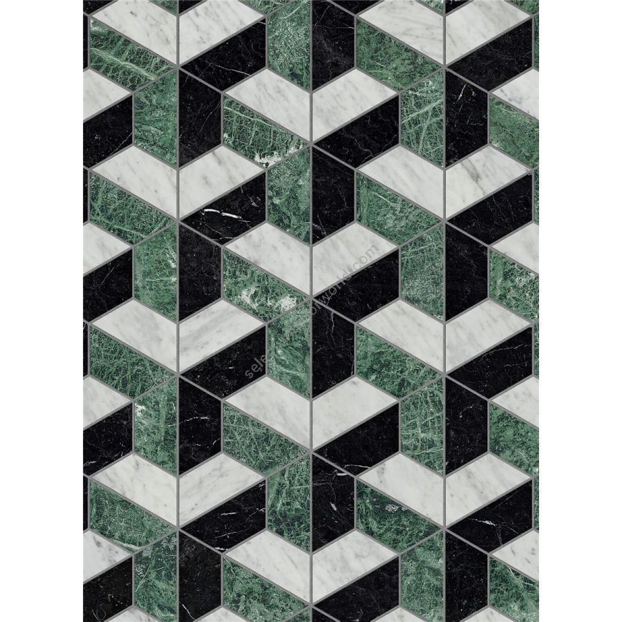 The items in the marmo collection, 1 cm thick, are honed, with a polished finish, and supplied in a ready-to-install units glued to paper mesh backing, with 2 mm grout lines.