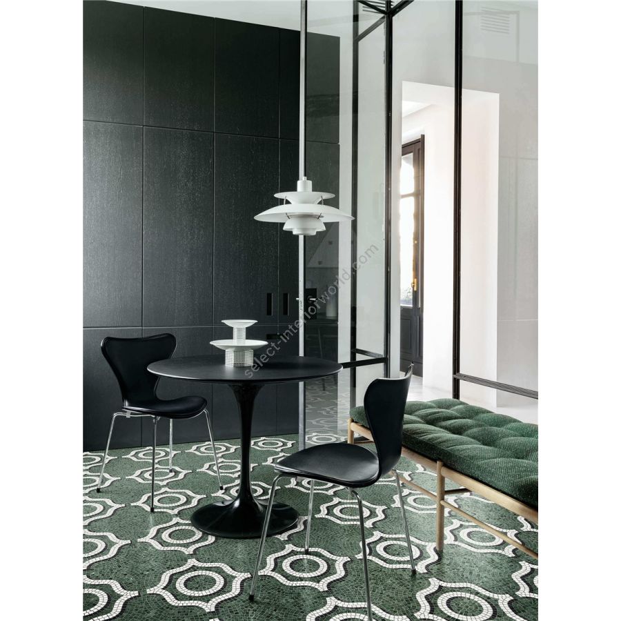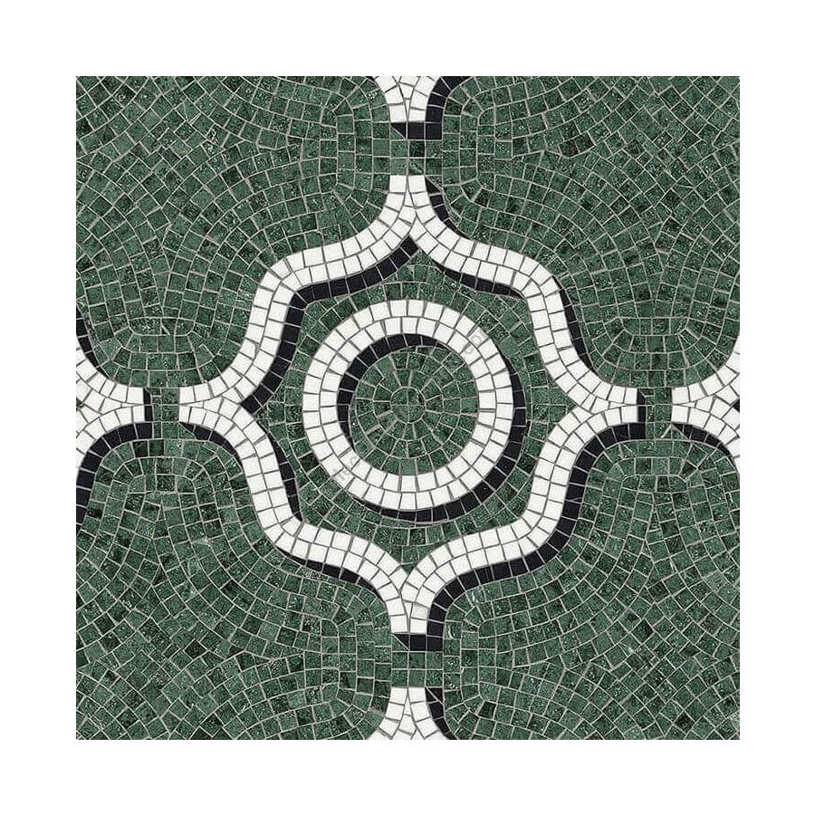 The decorative patterns in the marmosaico collection are made with honed marble mosaic tesserae, measuring 1,5x1,5 cm, with matt finish, cut to size and laid by hand to follow the design motif.