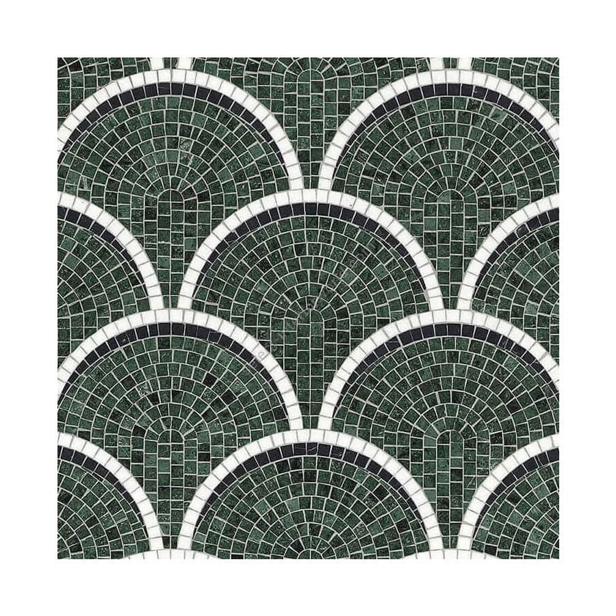 The decorative patterns in the marmosaico collection are made with honed marble mosaic tesserae, measuring 1,5x1,5 cm, with matt finish, cut to size and laid by hand to follow the design motif.